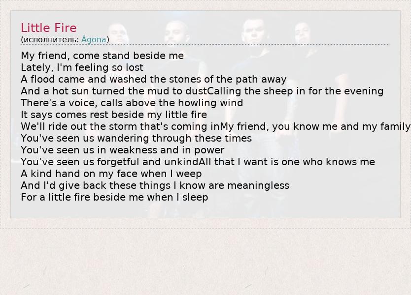 My friend, come stand beside me Lately, I'm feeling so lost A flood came and washed the stones of the path away And a hot sun turned the mud to dustCalling the sheep in for the evening There's a voice, calls above the howling wind It says comes rest beside my little fire We'll ride out the storm that's coming inMy friend, you know me and my family You've seen us wandering through these times You've seen us in weakness and in power You've seen us forgetful and unkindAll that I want is one who knows me A kind hand on my face when I weep And I'd give back these things I know are meaningless For a little fire beside me when I sleep
