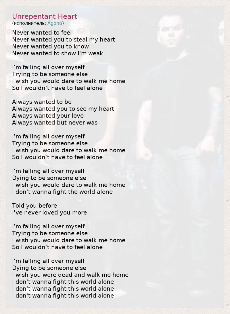 Never wanted to feel Never wanted you to steal my heart Never wanted you to know Never wanted to show I'm weak I'm falling all over myself Trying to be someone else I wish you would dare to walk me home So I wouldn't have to feel alone Always wanted to be Always wanted you to see my heart Always wanted your love Always wanted but never was I'm falling all over myself Trying to be someone else I wish you would dare to walk me home So I wouldn't have to feel alone I'm falling all over myself Dying to be someone else I wish you would dare to walk me home I don't wanna fight the world alone Told you before I've never loved you more I'm falling all over myself Trying to be someone else I wish you would dare to walk me home So I wouldn't have to feel alone I'm falling all over myself Dying to be someone else I wish you were dead and walk me home I don't wanna fight this world alone I don't wanna fight this world alone I don't wanna fight this world alone