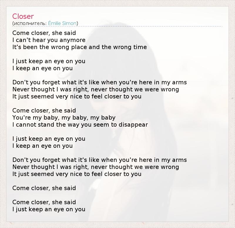 Come closer, she said I can't hear you anymore It's been the wrong place and the wrong time I just keep an eye on you I keep an eye on you Don't you forget what it's like when you're here in my arms Never thought I was right, never thought we were wrong It just seemed very nice to feel closer to you Come closer, she said You're my baby, my baby, my baby I cannot stand the way you seem to disappear I just keep an eye on you I keep an eye on you Don't you forget what it's like when you're here in my arms Never thought I was right, never thought we were wrong It just seemed very nice to feel closer to you Come closer, she said Come closer, she said I just keep an eye on you