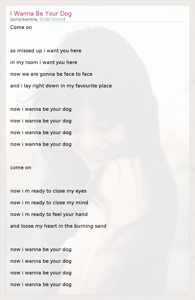 Come on so missed up i want you here in my room i want you here now we are gonna be face to face and i lay right down in my favourite place now i wanna be your dog now i wanna be your dog now i wanna be your dog now i wanna be your dog come on now i m ready to close my eyes now i m ready to close my mind now i m ready to feel your hand and loose my heart in the burning sand now i wanna be your dog now i wanna be your dog now i wanna be your dog now i wanna be your dog