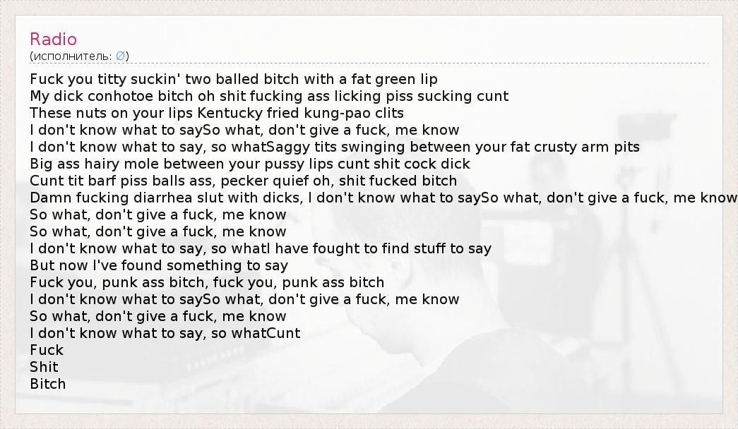 Fuck you titty suckin' two balled bitch with a fat green lip My dick conhotoe bitch oh shit fucking ass licking piss sucking cunt These nuts on your lips Kentucky fried kung-pao clits I don't know what to saySo what, don't give a fuck, me know I don't know what to say, so whatSaggy tits swinging between your fat crusty arm pits Big ass hairy mole between your pussy lips cunt shit cock dick Cunt tit barf piss balls ass, pecker quief oh, shit fucked bitch Damn fucking diarrhea slut with dicks, I don't know what to saySo what, don't give a fuck, me know So what, don't give a fuck, me know So what, don't give a fuck, me know I don't know what to say, so whatI have fought to find stuff to say But now I've found something to say Fuck you, punk ass bitch, fuck you, punk ass bitch I don't know what to saySo what, don't give a fuck, me know So what, don't give a fuck, me know I don't know what to say, so whatCunt Fuck Shit Bitch