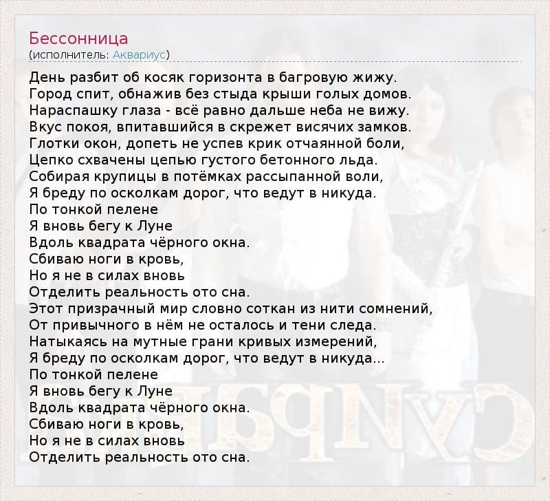 День разбит об косяк горизонта в багровую жижу. Город спит, обнажив без стыда крыши голых домов. Нараспашку глаза - всё равно дальше неба не вижу. Вкус покоя, впитавшийся в скрежет висячих замков. Глотки окон, допеть не успев крик отчаянной боли, Цепко схвачены цепью густого бетонного льда. Собирая крупицы в потёмках рассыпанной воли, Я бреду по осколкам дорог, что ведут в никуда. По тонкой пелене Я вновь бегу к Луне Вдоль квадрата чёрного окна. Сбиваю ноги в кровь, Но я не в силах вновь Отделить реальность ото сна. Этот призрачный мир словно соткан из нити сомнений, От привычного в нём не осталось и тени следа. Натыкаясь на мутные грани кривых измерений, Я бреду по осколкам дорог, что ведут в никуда... По тонкой пелене Я вновь бегу к Луне Вдоль квадрата чёрного окна. Сбиваю ноги в кровь, Но я не в силах вновь Отделить реальность ото сна.