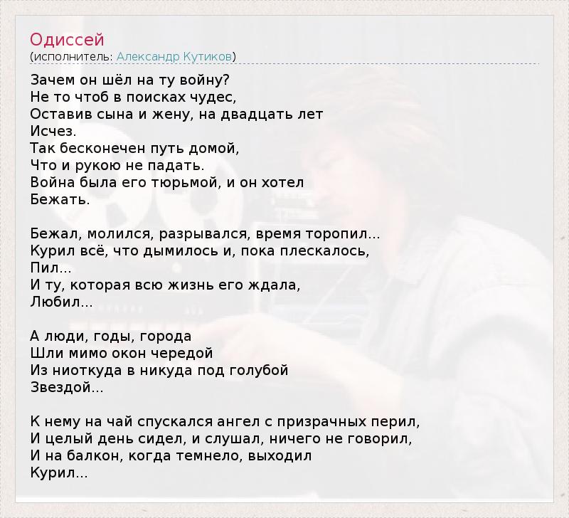 Зачем он шёл на ту войну? Не то чтоб в поисках чудес, Оставив сына и жену, на двадцать лет Исчез. Так бесконечен путь домой, Что и рукою не падать. Война была его тюрьмой, и он хотел Бежать. Бежал, молился, разрывался, время торопил... Курил всё, что дымилось и, пока плескалось, Пил... И ту, которая всю жизнь его ждала, Любил... А люди, годы, города Шли мимо окон чередой Из ниоткуда в никуда под голубой Звездой... К нему на чай спускался ангел с призрачных перил, И целый день сидел, и слушал, ничего не говорил, И на балкон, когда темнело, выходил Курил...