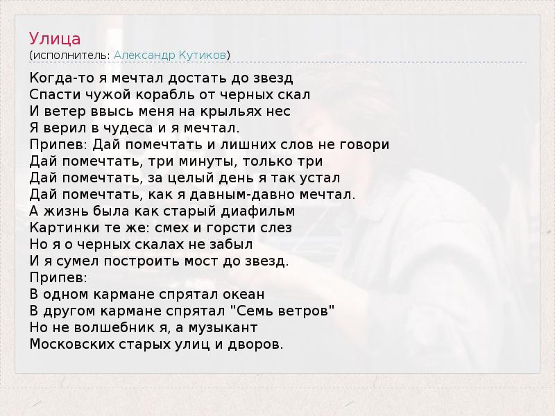 Когда-то я мечтал достать до звезд Спасти чужой корабль от черных скал И ветер ввысь меня на крыльях нес Я верил в чудеса и я мечтал. Припев: Дай помечтать и лишних слов не говори Дай помечтать, три минуты, только три Дай помечтать, за целый день я так устал Дай помечтать, как я давным-давно мечтал. А жизнь была как старый диафильм Картинки те же: смех и горсти слез Но я о черных скалах не забыл И я сумел построить мост до звезд. Припев: В одном кармане спрятал океан В другом кармане спрятал "Семь ветров" Но не волшебник я, а музыкант Московских старых улиц и дворов.