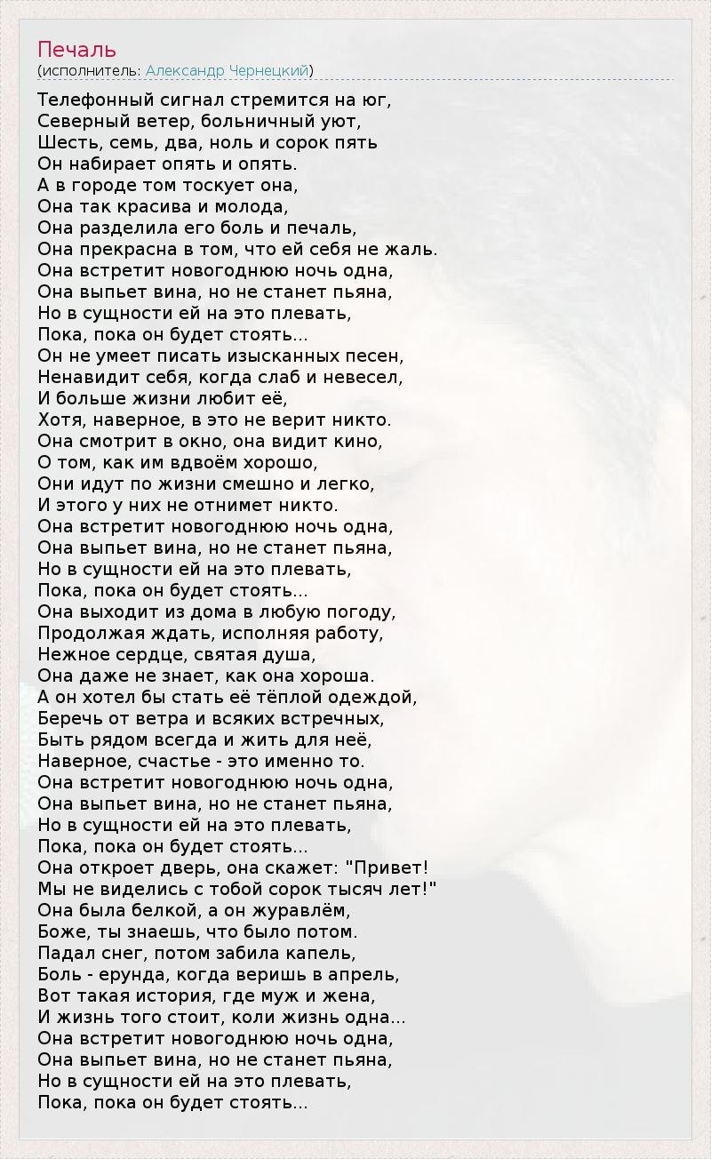 Телефонный сигнал стремится на юг, Северный ветер, больничный уют, Шесть, семь, два, ноль и сорок пять Он набирает опять и опять. А в городе том тоскует она, Она так красива и молода, Она разделила его боль и печаль, Она прекрасна в том, что ей себя не жаль. Она встретит новогоднюю ночь одна, Она выпьет вина, но не станет пьяна, Но в сущности ей на это плевать, Пока, пока он будет стоять... Он не умеет писать изысканных песен, Ненавидит себя, когда слаб и невесел, И больше жизни любит её, Хотя, наверное, в это не верит никто. Она смотрит в окно, она видит кино, О том, как им вдвоём хорошо, Они идут по жизни смешно и легко, И этого у них не отнимет никто. Она встретит новогоднюю ночь одна, Она выпьет вина, но не станет пьяна, Но в сущности ей на это плевать, Пока, пока он будет стоять... Она выходит из дома в любую погоду, Продолжая ждать, исполняя работу, Нежное сердце, святая душа, Она даже не знает, как она хороша. А он хотел бы стать её тёплой одеждой, Беречь от ветра и всяких встречных, Быть рядом всегда и жить для неё, Наверное, счастье - это именно то. Она встретит новогоднюю ночь одна, Она выпьет вина, но не станет пьяна, Но в сущности ей на это плевать, Пока, пока он будет стоять... Она откроет дверь, она скажет: "Привет! Мы не виделись с тобой сорок тысяч лет!" Она была белкой, а он журавлём, Боже, ты знаешь, что было потом. Падал снег, потом забила капель, Боль - ерунда, когда веришь в апрель, Вот такая история, где муж и жена, И жизнь того стоит, коли жизнь одна... Она встретит новогоднюю ночь одна, Она выпьет вина, но не станет пьяна, Но в сущности ей на это плевать, Пока, пока он будет стоять...
