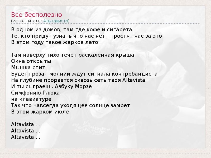 В одном из домов, там где кофе и сигарета Те, кто придут узнать что нас нет - простят нас за это В этом году такое жаркое лето Там наверху тихо течет раскаленная крыша Окна открыты Мышка спит Будет гроза - молнии ждут сигнала контррбандиста На глубине прорвется сквозь сеть твоя Altavista И ты сыграешь Азбуку Морзе Симфонию Глюка на клавиатуре Так что навсегда уходящее солнце замрет В этом жарком июле Altavista ... Altavista ... Altavista ...