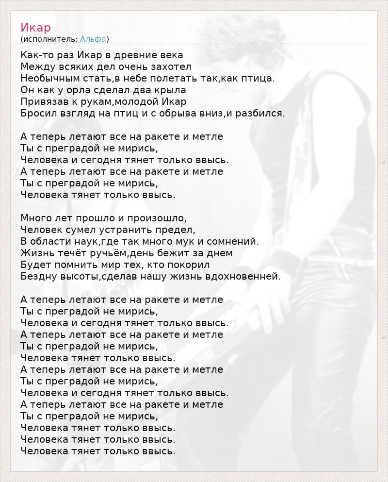 Как-то раз Икар в древние века Между всяких дел очень захотел Необычным стать,в небе полетать так,как птица. Он как у орла сделал два крыла Привязав к рукам,молодой Икар Бросил взгляд на птиц и с обрыва вниз,и разбился. А теперь летают все на ракете и метле Ты с преградой не мирись, Человека и сегодня тянет только ввысь. А теперь летают все на ракете и метле Ты с преградой не мирись, Человека тянет только ввысь. Много лет прошло и произошло, Человек сумел устранить предел, В области наук,где так много мук и сомнений. Жизнь течёт ручьём,день бежит за днем Будет помнить мир тех, кто покорил Бездну высоты,сделав нашу жизнь вдохновенней. А теперь летают все на ракете и метле Ты с преградой не мирись, Человека и сегодня тянет только ввысь. А теперь летают все на ракете и метле Ты с преградой не мирись, Человека тянет только ввысь. А теперь летают все на ракете и метле Ты с преградой не мирись, Человека и сегодня тянет только ввысь. А теперь летают все на ракете и метле Ты с преградой не мирись, Человека тянет только ввысь. Человека тянет только ввысь. Человека тянет только ввысь.