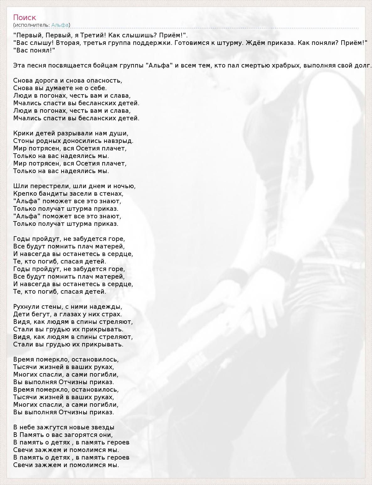 "Первый, Первый, я Третий! Как слышишь? Приём!". "Вас слышу! Вторая, третья группа поддержки. Готовимся к штурму. Ждём приказа. Как поняли? Приём!" "Вас понял!" Эта песня посвящается бойцам группы "Альфа" и всем тем, кто пал смертью храбрых, выполняя свой долг. Снова дорога и снова опасность, Снова вы думаете не о себе. Люди в погонах, честь вам и слава, Мчались спасти вы бесланских детей. Люди в погонах, честь вам и слава, Мчались спасти вы бесланских детей. Крики детей разрывали нам души, Стоны родных доносились навзрыд. Мир потрясен, вся Осетия плачет, Только на вас надеялись мы. Мир потрясен, вся Осетия плачет, Только на вас надеялись мы. Шли перестрели, шли днем и ночью, Крепко бандиты засели в стенах, "Альфа" поможет все это знают, Только получат штурма приказ. "Альфа" поможет все это знают, Только получат штурма приказ. Годы пройдут, не забудется горе, Все будут помнить плач матерей, И навсегда вы останетесь в сердце, Те, кто погиб, спасая детей. Годы пройдут, не забудется горе, Все будут помнить плач матерей, И навсегда вы останетесь в сердце, Те, кто погиб, спасая детей. Рухнули стены, с ними надежды, Дети бегут, а глазах у них страх. Видя, как людям в спины стреляют, Стали вы грудью их прикрывать. Видя, как людям в спины стреляют, Стали вы грудью их прикрывать. Время померкло, остановилось, Тысячи жизней в ваших руках, Многих спасли, а сами погибли, Вы выполняя Отчизны приказ. Время померкло, остановилось, Тысячи жизней в ваших руках, Многих спасли, а сами погибли, Вы выполняя Отчизны приказ. В небе зажгутся новые звезды В Память о вас загорятся они, В память о детях , в память героев Свечи зажжем и помолимся мы. В память о детях , в память героев Свечи зажжем и помолимся мы.