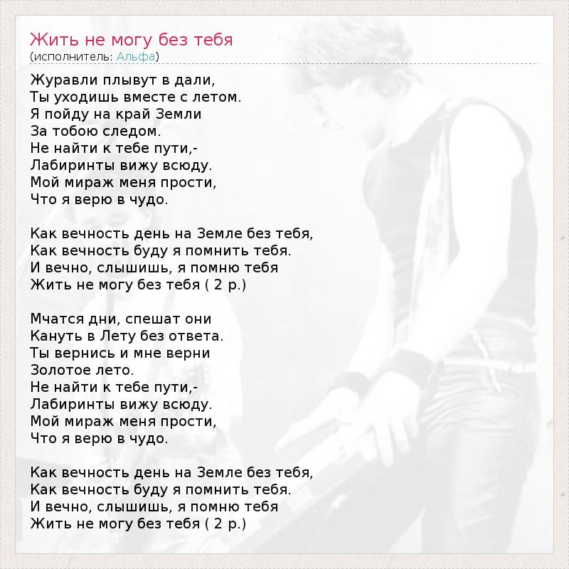 Журавли плывут в дали, Ты уходишь вместе с летом. Я пойду на край Земли За тобою следом. Не найти к тебе пути,- Лабиринты вижу всюду. Мой мираж меня прости, Что я верю в чудо. Как вечность день на Земле без тебя, Как вечность буду я помнить тебя. И вечно, слышишь, я помню тебя Жить не могу без тебя ( 2 р.) Мчатся дни, спешат они Кануть в Лету без ответа. Ты вернись и мне верни Золотое лето. Не найти к тебе пути,- Лабиринты вижу всюду. Мой мираж меня прости, Что я верю в чудо. Как вечность день на Земле без тебя, Как вечность буду я помнить тебя. И вечно, слышишь, я помню тебя Жить не могу без тебя ( 2 р.)