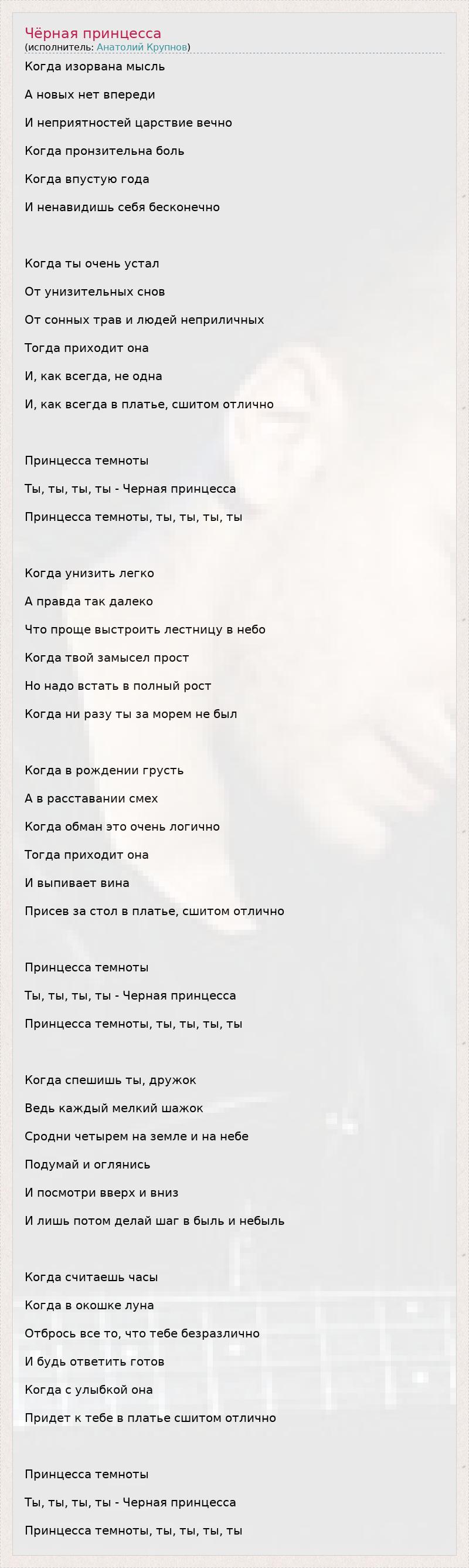 Когда изорвана мысль А новых нет впереди И неприятностей царствие вечно Когда пронзительна боль Когда впустую года И ненавидишь себя бесконечно Когда ты очень устал От унизительных снов От сонных трав и людей неприличных Тогда приходит она И, как всегда, не одна И, как всегда в платье, сшитом отлично Принцесса темноты Ты, ты, ты, ты - Черная принцесса Принцесса темноты, ты, ты, ты, ты Когда унизить легко А правда так далеко Что проще выстроить лестницу в небо Когда твой замысел прост Но надо встать в полный рост Когда ни разу ты за морем не был Когда в рождении грусть А в расставании смех Когда обман это очень логично Тогда приходит она И выпивает вина Присев за стол в платье, сшитом отлично Принцесса темноты Ты, ты, ты, ты - Черная принцесса Принцесса темноты, ты, ты, ты, ты Когда спешишь ты, дружок Ведь каждый мелкий шажок Сродни четырем на земле и на небе Подумай и оглянись И посмотри вверх и вниз И лишь потом делай шаг в быль и небыль Когда считаешь часы Когда в окошке луна Отбрось все то, что тебе безразлично И будь ответить готов Когда с улыбкой она Придет к тебе в платье сшитом отлично Принцесса темноты Ты, ты, ты, ты - Черная принцесса Принцесса темноты, ты, ты, ты, ты