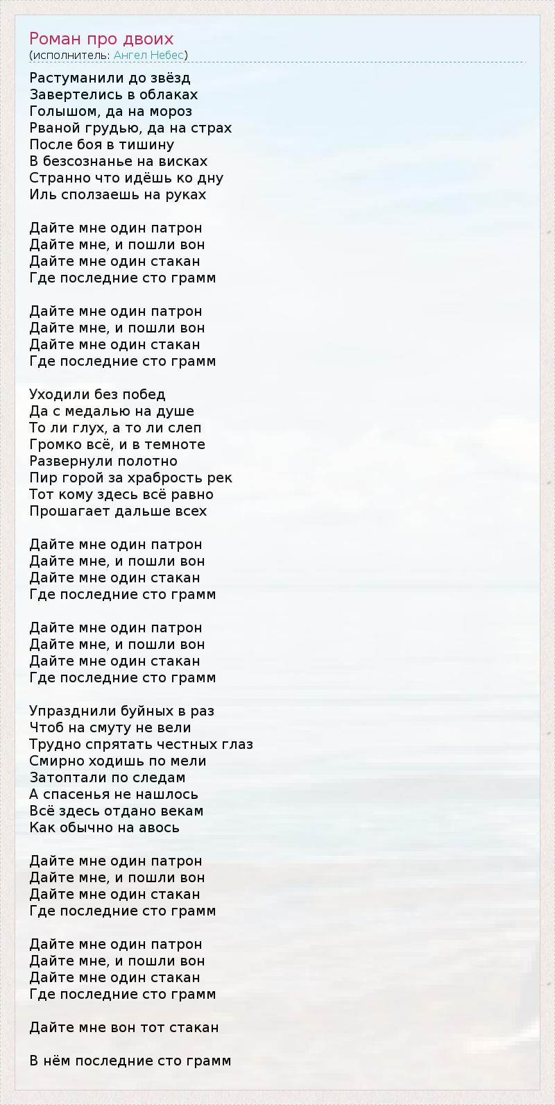 Растуманили до звёзд Завертелись в облаках Голышом, да на мороз Рваной грудью, да на страх После боя в тишину В безсознанье на висках Странно что идёшь ко дну Иль сползаешь на руках Дайте мне один патрон Дайте мне, и пошли вон Дайте мне один стакан Где последние сто грамм Дайте мне один патрон Дайте мне, и пошли вон Дайте мне один стакан Где последние сто грамм Уходили без побед Да с медалью на душе То ли глух, а то ли слеп Громко всё, и в темноте Развернули полотно Пир горой за храбрость рек Тот кому здесь всё равно Прошагает дальше всех Дайте мне один патрон Дайте мне, и пошли вон Дайте мне один стакан Где последние сто грамм Дайте мне один патрон Дайте мне, и пошли вон Дайте мне один стакан Где последние сто грамм Упразднили буйных в раз Чтоб на смуту не вели Трудно спрятать честных глаз Смирно ходишь по мели Затоптали по следам А спасенья не нашлось Всё здесь отдано векам Как обычно на авось Дайте мне один патрон Дайте мне, и пошли вон Дайте мне один стакан Где последние сто грамм Дайте мне один патрон Дайте мне, и пошли вон Дайте мне один стакан Где последние сто грамм Дайте мне вон тот стакан В нём последние сто грамм