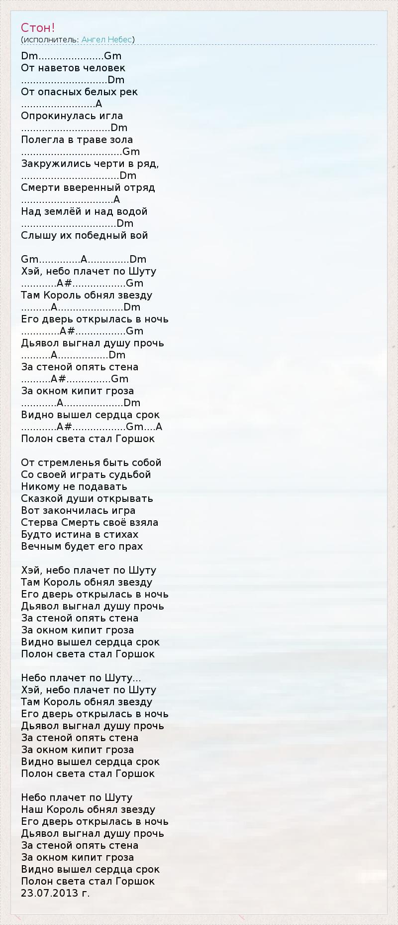 Dm......................Gm От наветов человек .............................Dm От опасных белых рек .........................A Опрокинулась игла ..............................Dm Полегла в траве зола ..................................Gm Закружились черти в ряд, .................................Dm Смерти вверенный отряд ...............................A Над землёй и над водой ................................Dm Слышу их победный вой Gm..............A..............Dm Хэй, небо плачет по Шуту ............A#..................Gm Там Король обнял звезду ..........A......................Dm Его дверь открылась в ночь .............A#.................Gm Дьявол выгнал душу прочь ..........A.................Dm За стеной опять стена ..........A#...............Gm За окном кипит гроза ............A....................Dm Видно вышел сердца срок ............A#..................Gm....A Полон света стал Горшок От стремленья быть собой Со своей играть судьбой Никому не подавать Сказкой души открывать Вот закончилась игра Стерва Смерть своё взяла Будто истина в стихах Вечным будет его прах Хэй, небо плачет по Шуту Там Король обнял звезду Его дверь открылась в ночь Дьявол выгнал душу прочь За стеной опять стена За окном кипит гроза Видно вышел сердца срок Полон света стал Горшок Небо плачет по Шуту... Хэй, небо плачет по Шуту Там Король обнял звезду Его дверь открылась в ночь Дьявол выгнал душу прочь За стеной опять стена За окном кипит гроза Видно вышел сердца срок Полон света стал Горшок Небо плачет по Шуту Наш Король обнял звезду Его дверь открылась в ночь Дьявол выгнал душу прочь За стеной опять стена За окном кипит гроза Видно вышел сердца срок Полон света стал Горшок 23.07.2013 г.