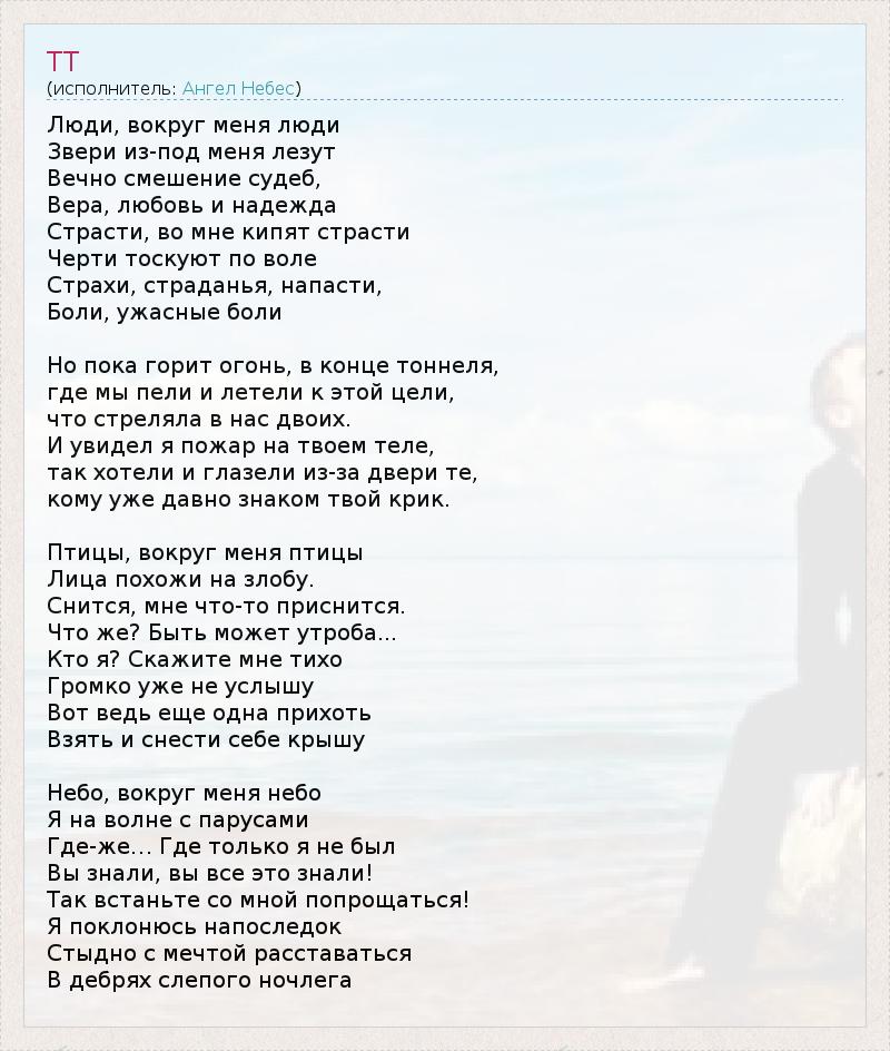 Люди, вокруг меня люди Звери из-под меня лезут Вечно смешение судеб, Вера, любовь и надежда Страсти, во мне кипят страсти Черти тоскуют по воле Страхи, страданья, напасти, Боли, ужасные боли Но пока горит огонь, в конце тоннеля, где мы пели и летели к этой цели, что стреляла в нас двоих. И увидел я пожар на твоем теле, так хотели и глазели из-за двери те, кому уже давно знаком твой крик. Птицы, вокруг меня птицы Лица похожи на злобу. Снится, мне что-то приснится. Что же? Быть может утроба... Кто я? Скажите мне тихо Громко уже не услышу Вот ведь еще одна прихоть Взять и снести себе крышу Небо, вокруг меня небо Я на волне с парусами Где-же… Где только я не был Вы знали, вы все это знали! Так встаньте со мной попрощаться! Я поклонюсь напоследок Стыдно с мечтой расставаться В дебрях слепого ночлега