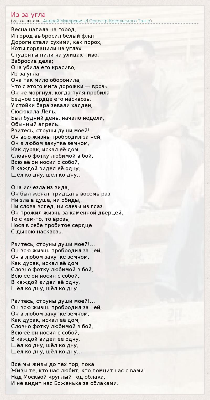 Весна напала на город, И город выбросил белый флаг. Дороги стали сухими, как порох, Коты горланили на углах. Студенты пили на улицах пиво, Забросив дела; Она убила его красиво, Из-за угла. Она так мило оборонила, Что с этого мига дорожки — врозь, Он не моргнул, когда пуля пробила Бедное сердце его насквозь. У стойки бара зевали халдеи, Сюсюкала Лель. Был будний день, начало недели, Обычный апрель. Рвитесь, струны души моей!… Он всю жизнь пробродил за ней, Он в любом закутке земном, Как дурак, искал её дом. Словно фотку любимой в бой, Всю её он носил с собой, В каждой видел её одну, Шёл ко дну, шёл ко дну… Она исчезла из вида, Он был женат тридцать восемь раз. Ни зла в душе, ни обиды, Ни слова вслед, ни слезы из глаз. Он прожил жизнь за каменной дверцей, То с кем-то, то врозь, Нося в себе пробитое сердце С дырою насквозь. Рвитесь, струны души моей!… Он всю жизнь пробродил за ней, Он в любом закутке земном, Как дурак, искал её дом. Словно фотку любимой в бой, Всю её он носил с собой, В каждой видел её одну, Шёл ко дну, шёл ко дну… Рвитесь, струны души моей!… Он всю жизнь пробродил за ней, Он в любом закутке земном, Как дурак, искал её дом, Словно фотку любимой в бой, Всю её он носил с собой, В каждой видел её одну, Шёл ко дну, шёл ко дну, Шёл ко дну, шёл ко дну… Все мы живы до тех пор, пока Живы те, кто нас любит, кто помнит нас с вами. Над Москвой круглый год облака, И не видит нас Боженька за облаками.