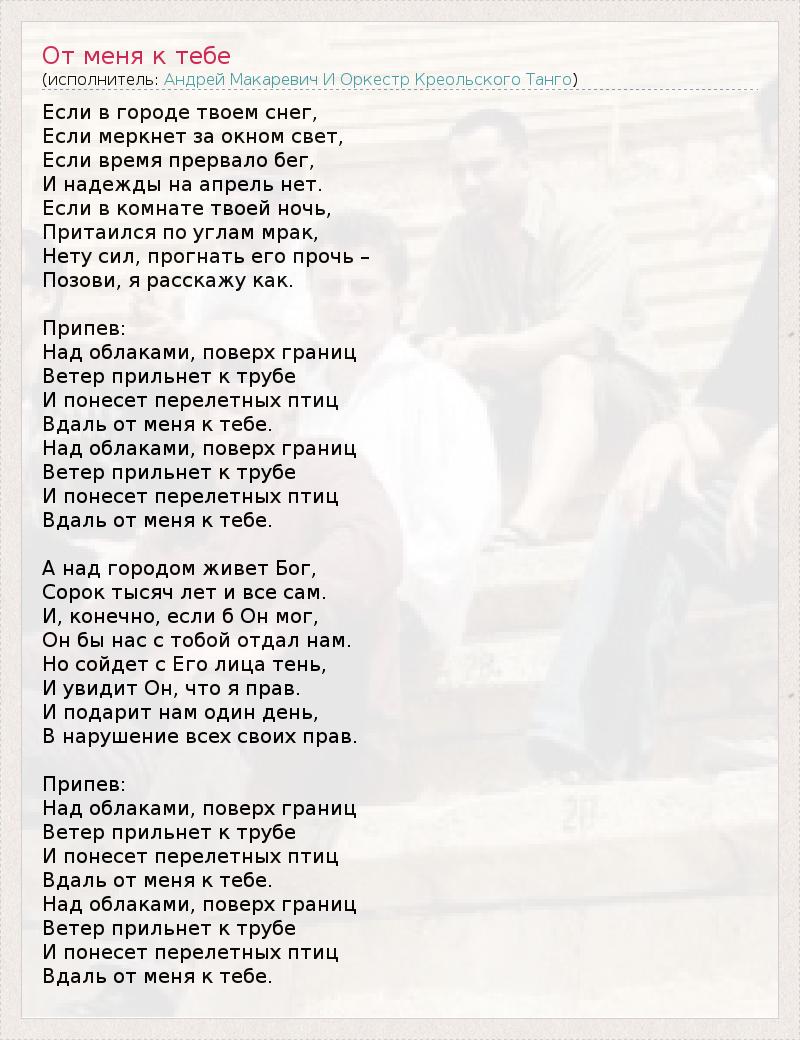 Если в городе твоем снег, Если меркнет за окном свет, Если время прервало бег, И надежды на апрель нет. Если в комнате твоей ночь, Притаился по углам мрак, Нету сил, прогнать его прочь – Позови, я расскажу как. Припев: Над облаками, поверх границ Ветер прильнет к трубе И понесет перелетных птиц Вдаль от меня к тебе. Над облаками, поверх границ Ветер прильнет к трубе И понесет перелетных птиц Вдаль от меня к тебе. А над городом живет Бог, Сорок тысяч лет и все сам. И, конечно, если б Он мог, Он бы нас с тобой отдал нам. Но сойдет с Его лица тень, И увидит Он, что я прав. И подарит нам один день, В нарушение всех своих прав. Припев: Над облаками, поверх границ Ветер прильнет к трубе И понесет перелетных птиц Вдаль от меня к тебе. Над облаками, поверх границ Ветер прильнет к трубе И понесет перелетных птиц Вдаль от меня к тебе.