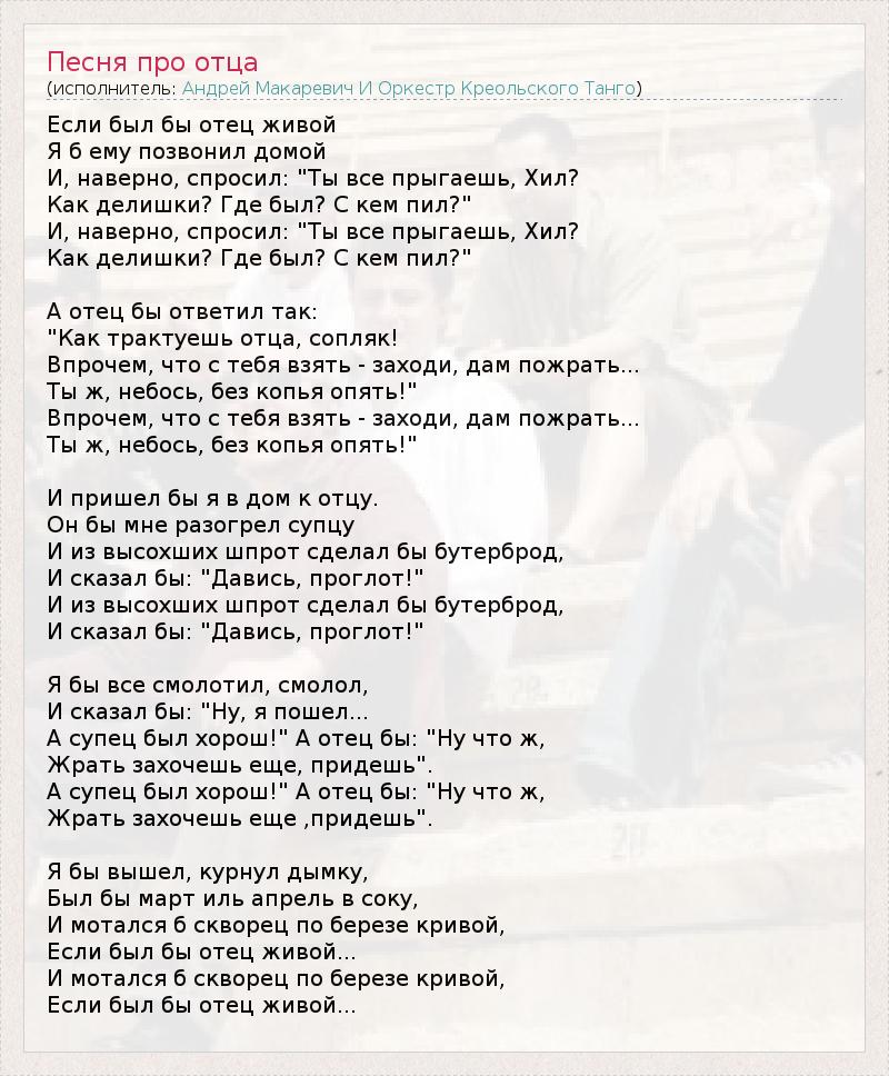 Если был бы отец живой Я б ему позвонил домой И, наверно, спросил: "Ты все прыгаешь, Хил? Как делишки? Где был? С кем пил?" И, наверно, спросил: "Ты все прыгаешь, Хил? Как делишки? Где был? С кем пил?" А отец бы ответил так: "Как трактуешь отца, сопляк! Впрочем, что с тебя взять - заходи, дам пожрать... Ты ж, небось, без копья опять!" Впрочем, что с тебя взять - заходи, дам пожрать... Ты ж, небось, без копья опять!" И пришел бы я в дом к отцу. Он бы мне разогрел супцу И из высохших шпрот сделал бы бутерброд, И сказал бы: "Давись, проглот!" И из высохших шпрот сделал бы бутерброд, И сказал бы: "Давись, проглот!" Я бы все смолотил, смолол, И сказал бы: "Ну, я пошел... А супец был хорош!" А отец бы: "Ну что ж, Жрать захочешь еще, придешь". А супец был хорош!" А отец бы: "Ну что ж, Жрать захочешь еще ,придешь". Я бы вышел, курнул дымку, Был бы март иль апрель в соку, И мотался б скворец по березе кривой, Если был бы отец живой... И мотался б скворец по березе кривой, Если был бы отец живой...