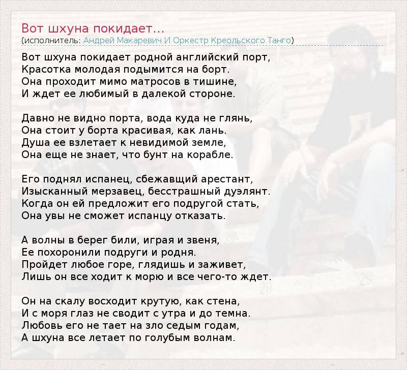 А как ты думаешь, о чем песня "Вот шхуна покидает..." ?
