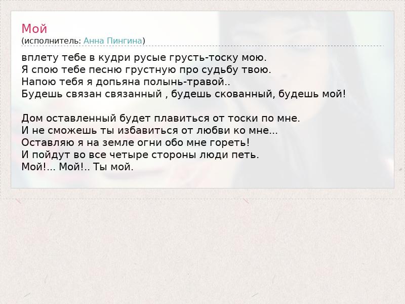 Это интересно:Анна Пингина (Anna Pingina) – певица, актриса, автор песен, лидер и основатель собственного коллектива."Современная музыка с корневой основой".Родилась в г. Армавире на Кубани. Петь начала в раннем детстве, подпевая виниловым пластинкам, писать - с 13 лет.В 1996 году, после Юридического техникума, Анна поступила на отделение «Актер музыкального театра» в Краснодарского музыкального... продолжение