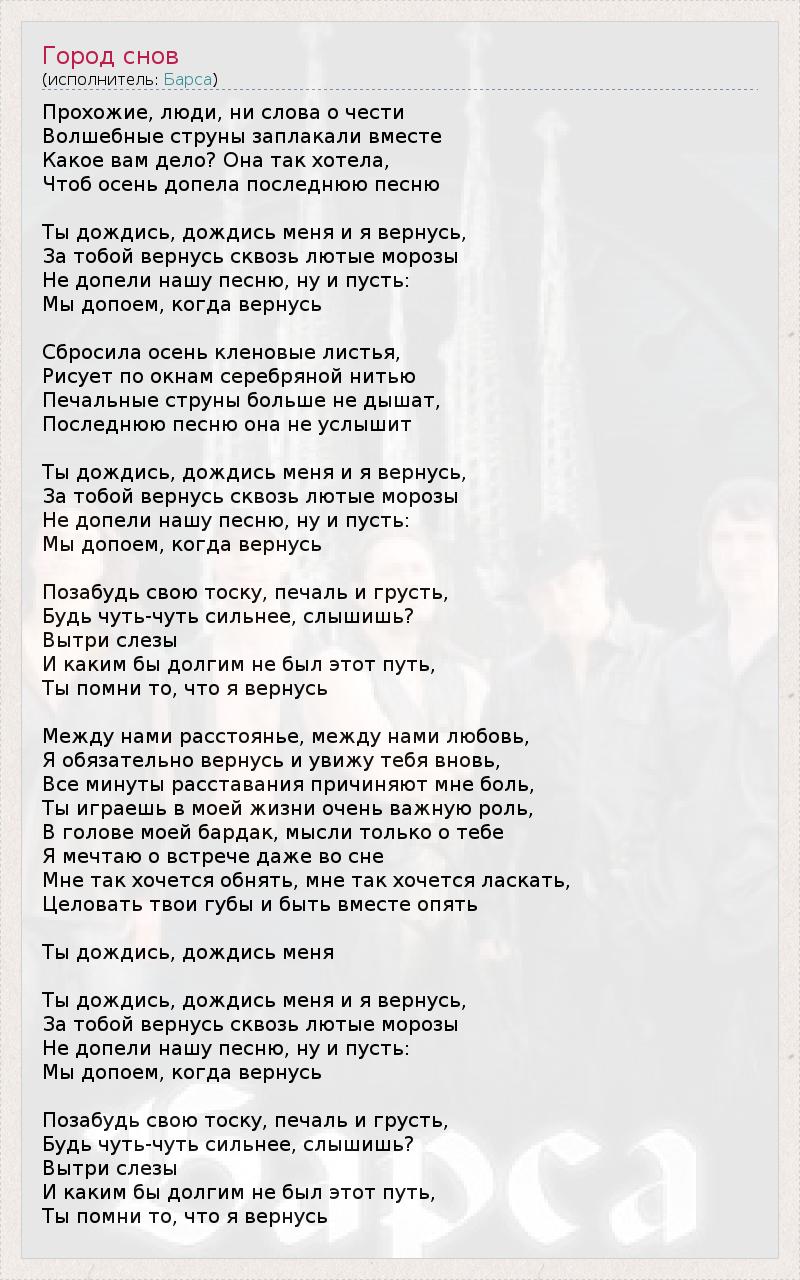 Прохожие, люди, ни слова о чести Волшебные струны заплакали вместе Какое вам дело? Она так хотела, Чтоб осень допела последнюю песню Ты дождись, дождись меня и я вернусь, За тобой вернусь сквозь лютые морозы Не допели нашу песню, ну и пусть: Мы допоем, когда вернусь Сбросила осень кленовые листья, Рисует по окнам серебряной нитью Печальные струны больше не дышат, Последнюю песню она не услышит Ты дождись, дождись меня и я вернусь, За тобой вернусь сквозь лютые морозы Не допели нашу песню, ну и пусть: Мы допоем, когда вернусь Позабудь свою тоску, печаль и грусть, Будь чуть-чуть сильнее, слышишь? Вытри слезы И каким бы долгим не был этот путь, Ты помни то, что я вернусь Между нами расстоянье, между нами любовь, Я обязательно вернусь и увижу тебя вновь, Все минуты расставания причиняют мне боль, Ты играешь в моей жизни очень важную роль, В голове моей бардак, мысли только о тебе Я мечтаю о встрече даже во сне Мне так хочется обнять, мне так хочется ласкать, Целовать твои губы и быть вместе опять Ты дождись, дождись меня Ты дождись, дождись меня и я вернусь, За тобой вернусь сквозь лютые морозы Не допели нашу песню, ну и пусть: Мы допоем, когда вернусь Позабудь свою тоску, печаль и грусть, Будь чуть-чуть сильнее, слышишь? Вытри слезы И каким бы долгим не был этот путь, Ты помни то, что я вернусь