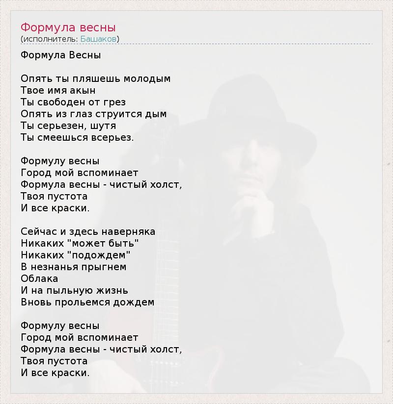Формула Весны Опять ты пляшешь молодым Твое имя акын Ты свободен от грез Опять из глаз струится дым Ты серьезен, шутя Ты смеешься всерьез. Формулу весны Город мой вспоминает Формула весны - чистый холст, Твоя пустота И все краски. Сейчас и здесь наверняка Никаких "может быть" Никаких "подождем" В незнанья прыгнем Облака И на пыльную жизнь Вновь прольемся дождем Формулу весны Город мой вспоминает Формула весны - чистый холст, Твоя пустота И все краски.