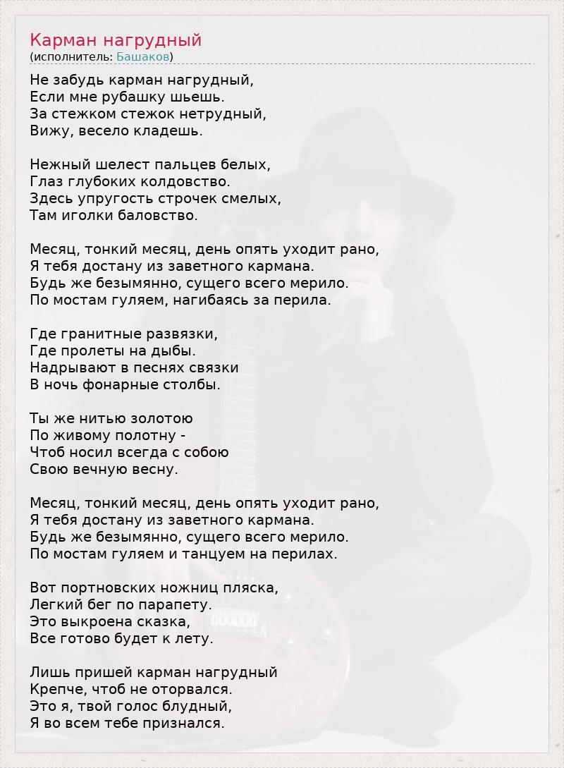Не забудь карман нагрудный, Если мне рубашку шьешь. За стежком стежок нетрудный, Вижу, весело кладешь. Нежный шелест пальцев белых, Глаз глубоких колдовство. Здесь упругость строчек смелых, Там иголки баловство. Месяц, тонкий месяц, день опять уходит рано, Я тебя достану из заветного кармана. Будь же безымянно, сущего всего мерило. По мостам гуляем, нагибаясь за перила. Где гранитные развязки, Где пролеты на дыбы. Надрывают в песнях связки В ночь фонарные столбы. Ты же нитью золотою По живому полотну - Чтоб носил всегда с собою Свою вечную весну. Месяц, тонкий месяц, день опять уходит рано, Я тебя достану из заветного кармана. Будь же безымянно, сущего всего мерило. По мостам гуляем и танцуем на перилах. Вот портновских ножниц пляска, Легкий бег по парапету. Это выкроена сказка, Все готово будет к лету. Лишь пришей карман нагрудный Крепче, чтоб не оторвался. Это я, твой голос блудный, Я во всем тебе признался.