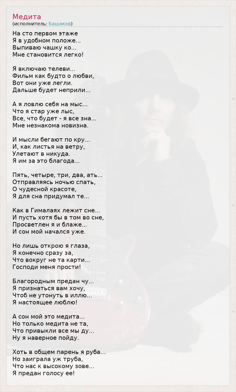 На сто первом этаже Я в удобном положе... Выпиваю чашку ко... Мне становится легко! Я включаю телеви... Фильм как будто о любви, Вот они уже легли. Дальше будет неприли... А я ловлю себя на мыс... Что я стар уже лыс, Все, что будет - я все зна... Мне незнакома новизна. И мысли бегают по кру... И, как листья на ветру, Улетают в никуда. Я им за это благода... Пять, четыре, три, два, ать... Отправляясь ночью спать, О чудесной красоте, Я для сна придумал те... Как в Гималаях лежит сне... И пусть хотя бы в том во сне, Просветлен я и блаже... И сон мой начался уже. Но лишь открою я глаза, Я конечно сразу за, Что вокруг не та карти... Господи меня прости! Благородным предан чу... Я признаться вам хочу, Чтоб не утонуть в иллю... Я настоящее люблю! А сон мой это медита... Но только медита не та, Что привыкли все мы ду... Ну я наверное пойду. Хоть в общем парень я руба... Но заиграла уж труба, Что нас к высокому зове... Я предан голосу ее!