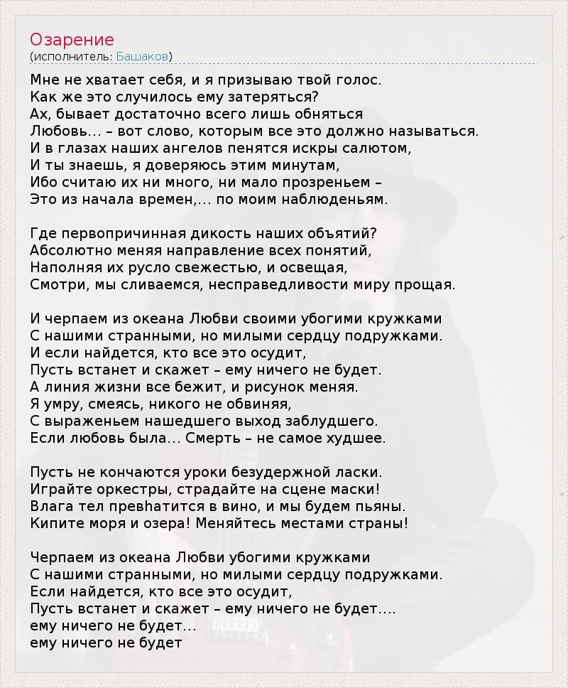 Мне не хватает себя, и я призываю твой голос. Как же это случилось ему затеряться? Ах, бывает достаточно всего лишь обняться Любовь… – вот слово, которым все это должно называться. И в глазах наших ангелов пенятся искры салютом, И ты знаешь, я доверяюсь этим минутам, Ибо считаю их ни много, ни мало прозреньем – Это из начала времен,… по моим наблюденьям. Где первопричинная дикость наших объятий? Абсолютно меняя направление всех понятий, Наполняя их русло свежестью, и освещая, Смотри, мы сливаемся, несправедливости миру прощая. И черпаем из океана Любви своими убогими кружками С нашими странными, но милыми сердцу подружками. И если найдется, кто все это осудит, Пусть встанет и скажет – ему ничего не будет. А линия жизни все бежит, и рисунок меняя. Я умру, смеясь, никого не обвиняя, С выраженьем нашедшего выход заблудшего. Если любовь была… Смерть – не самое худшее. Пусть не кончаются уроки безудержной ласки. Играйте оркестры, страдайте на сцене маски! Влага тел превhатится в вино, и мы будем пьяны. Кипите моря и озера! Меняйтесь местами страны! Черпаем из океана Любви убогими кружками С нашими странными, но милыми сердцу подружками. Если найдется, кто все это осудит, Пусть встанет и скажет – ему ничего не будет…. ему ничего не будет… ему ничего не будет