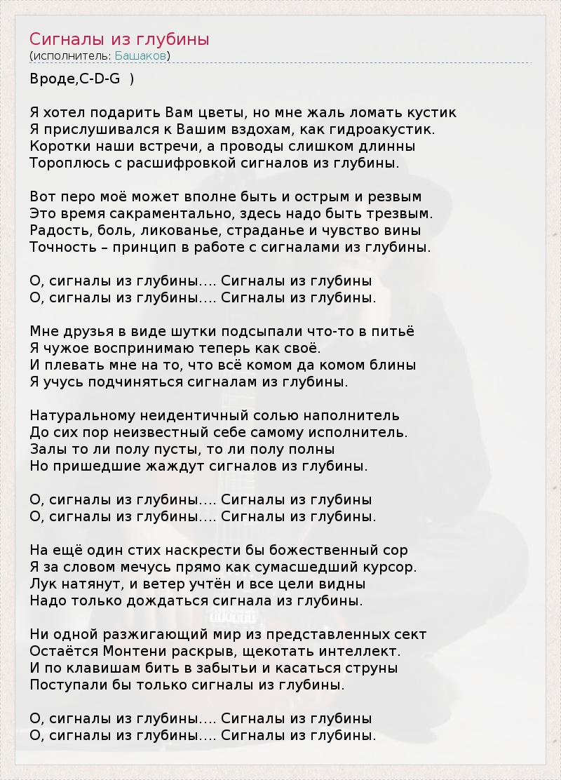 Вроде,C-D-G ) Я хотел подарить Вам цветы, но мне жаль ломать кустик Я прислушивался к Вашим вздохам, как гидроакустик. Коротки наши встречи, а проводы слишком длинны Тороплюсь с расшифровкой сигналов из глубины. Вот перо моё может вполне быть и острым и резвым Это время сакраментально, здесь надо быть трезвым. Радость, боль, ликованье, страданье и чувство вины Точность – принцип в работе с сигналами из глубины. О, сигналы из глубины…. Сигналы из глубины О, сигналы из глубины…. Сигналы из глубины. Мне друзья в виде шутки подсыпали что-то в питьё Я чужое воспринимаю теперь как своё. И плевать мне на то, что всё комом да комом блины Я учусь подчиняться сигналам из глубины. Натуральному неидентичный солью наполнитель До сих пор неизвестный себе самому исполнитель. Залы то ли полу пусты, то ли полу полны Но пришедшие жаждут сигналов из глубины. О, сигналы из глубины…. Сигналы из глубины О, сигналы из глубины…. Сигналы из глубины. На ещё один стих наскрести бы божественный сор Я за словом мечусь прямо как сумасшедший курсор. Лук натянут, и ветер учтён и все цели видны Надо только дождаться сигнала из глубины. Ни одной разжигающий мир из представленных сект Остаётся Монтени раскрыв, щекотать интеллект. И по клавишам бить в забытьи и касаться струны Поступали бы только сигналы из глубины. О, сигналы из глубины…. Сигналы из глубины О, сигналы из глубины…. Сигналы из глубины.