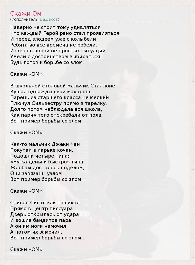 Наверно не стоит тому удивляться, Что каждый Герой рано стал проявляться. И перед злодеем уже с колыбели Ребята во все времена не робели. Из очень порой не простых ситуаций Умели с достоинством выбираться. Будь готов к борьбе со злом. Скажи «ОМ». В школьной столовой мальчик Сталлоне Кушал однажды свои макароны. Парень из старшего класса не мелкий Плюнул Сильвестру прямо в тарелку. Долго потом наблюдала вся школа, Как парня того отскребали от пола. Вот пример борьбы со злом. Скажи «ОМ». Как-то мальчик Джеки Чан Покупал в ларьке кочан. Подошли четыре типа: «Ну-ка деньги быстро» типа. Жлобам досталось поделом, Они завязаны узлом. Вот пример борьбы со злом. Скажи «ОМ». Стивен Сигал как-то сикал Прямо в центр писсуара. Дверь открылась от удара И вошла бандитов пара. А он им ноги намочил, А потом их замочил. Вот пример борьбы со злом. Скажи «ОМ».