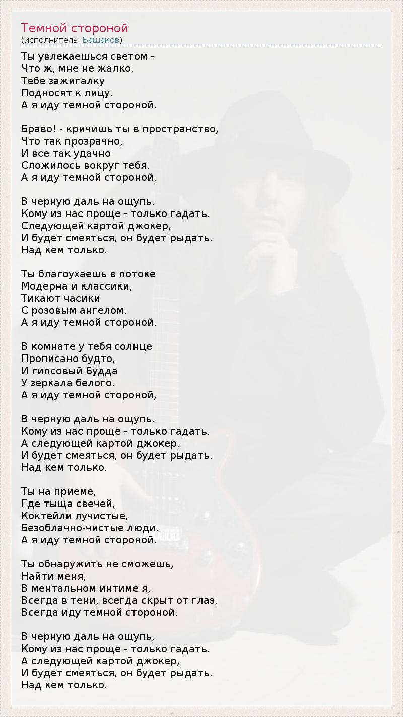 Ты увлекаешься светом - Что ж, мне не жалко. Тебе зажигалку Подносят к лицу. А я иду темной стороной. Браво! - кричишь ты в пространство, Что так прозрачно, И все так удачно Сложилось вокруг тебя. А я иду темной стороной, В черную даль на ощупь. Кому из нас проще - только гадать. Следующей картой джокер, И будет смеяться, он будет рыдать. Над кем только. Ты благоухаешь в потоке Модерна и классики, Тикают часики С розовым ангелом. А я иду темной стороной. В комнате у тебя солнце Прописано будто, И гипсовый Будда У зеркала белого. А я иду темной стороной, В черную даль на ощупь. Кому из нас проще - только гадать. А следующей картой джокер, И будет смеяться, он будет рыдать. Над кем только. Ты на приеме, Где тыща свечей, Коктейли лучистые, Безоблачно-чистые люди. А я иду темной стороной. Ты обнаружить не сможешь, Найти меня, В ментальном интиме я, Всегда в тени, всегда скрыт от глаз, Всегда иду темной стороной. В черную даль на ощупь, Кому из нас проще - только гадать. А следующей картой джокер, И будет смеяться, он будет рыдать. Над кем только.