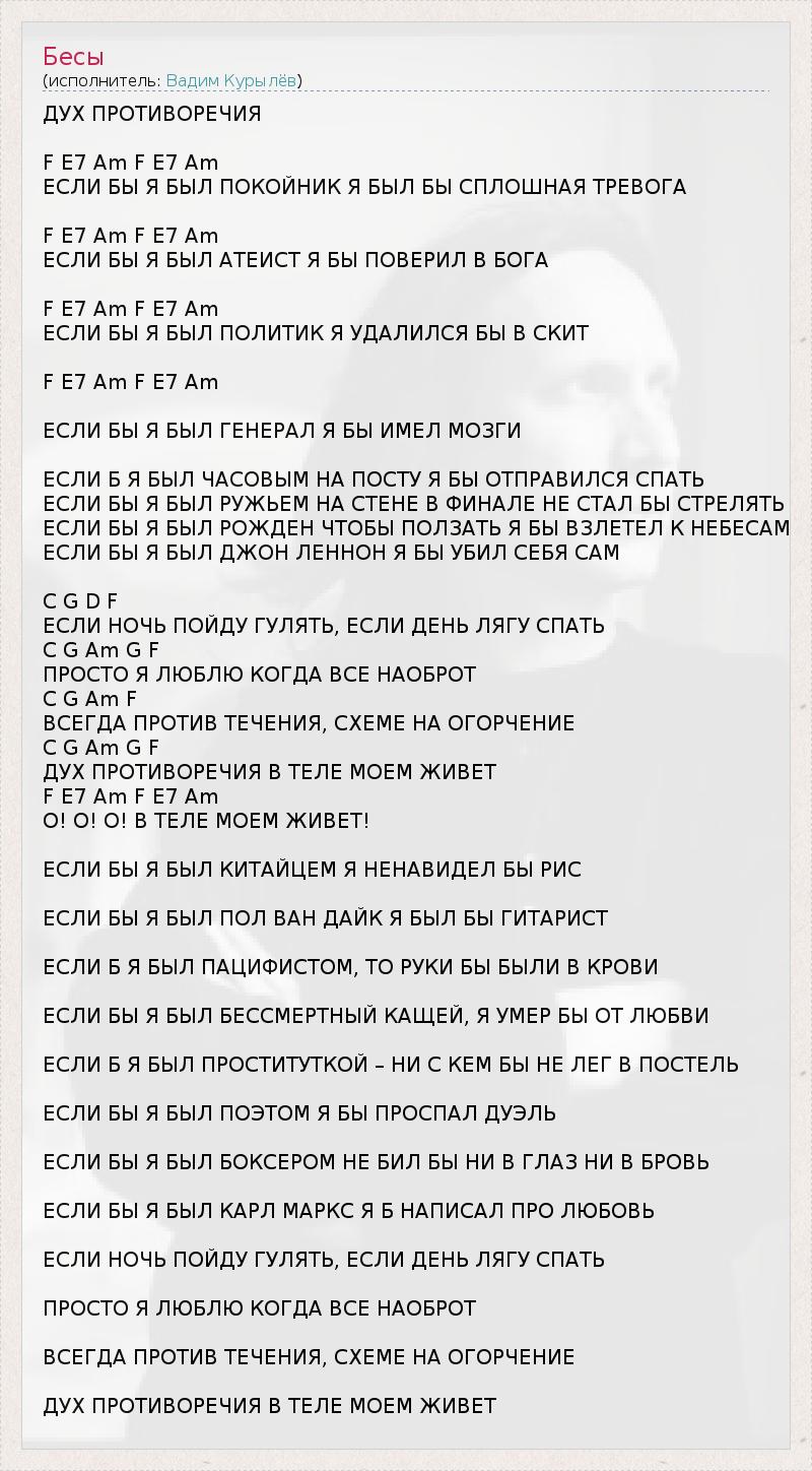 ДУХ ПРОТИВОРЕЧИЯ F E7 Am F E7 Am ЕСЛИ БЫ Я БЫЛ ПОКОЙНИК Я БЫЛ БЫ СПЛОШНАЯ ТРЕВОГА F E7 Am F E7 Am ЕСЛИ БЫ Я БЫЛ АТЕИСТ Я БЫ ПОВЕРИЛ В БОГА F E7 Am F E7 Am ЕСЛИ БЫ Я БЫЛ ПОЛИТИК Я УДАЛИЛСЯ БЫ В СКИТ F E7 Am F E7 Am ЕСЛИ БЫ Я БЫЛ ГЕНЕРАЛ Я БЫ ИМЕЛ МОЗГИ ЕСЛИ Б Я БЫЛ ЧАСОВЫМ НА ПОСТУ Я БЫ ОТПРАВИЛСЯ СПАТЬ ЕСЛИ БЫ Я БЫЛ РУЖЬЕМ НА СТЕНЕ В ФИНАЛЕ НЕ СТАЛ БЫ СТРЕЛЯТЬ ЕСЛИ БЫ Я БЫЛ РОЖДЕН ЧТОБЫ ПОЛЗАТЬ Я БЫ ВЗЛЕТЕЛ К НЕБЕСАМ ЕСЛИ БЫ Я БЫЛ ДЖОН ЛЕННОН Я БЫ УБИЛ СЕБЯ САМ C G D F ЕСЛИ НОЧЬ ПОЙДУ ГУЛЯТЬ, ЕСЛИ ДЕНЬ ЛЯГУ СПАТЬ C G Am G F ПРОСТО Я ЛЮБЛЮ КОГДА ВСЕ НАОБРОТ C G Am F ВСЕГДА ПРОТИВ ТЕЧЕНИЯ, СХЕМЕ НА ОГОРЧЕНИЕ C G Am G F ДУХ ПРОТИВОРЕЧИЯ В ТЕЛЕ МОЕМ ЖИВЕТ F E7 Am F E7 Am О! О! О! В ТЕЛЕ МОЕМ ЖИВЕТ! ЕСЛИ БЫ Я БЫЛ КИТАЙЦЕМ Я НЕНАВИДЕЛ БЫ РИС ЕСЛИ БЫ Я БЫЛ ПОЛ ВАН ДАЙК Я БЫЛ БЫ ГИТАРИСТ ЕСЛИ Б Я БЫЛ ПАЦИФИСТОМ, ТО РУКИ БЫ БЫЛИ В КРОВИ ЕСЛИ БЫ Я БЫЛ БЕССМЕРТНЫЙ КАЩЕЙ, Я УМЕР БЫ ОТ ЛЮБВИ ЕСЛИ Б Я БЫЛ ПРОСТИТУТКОЙ – НИ С КЕМ БЫ НЕ ЛЕГ В ПОСТЕЛЬ ЕСЛИ БЫ Я БЫЛ ПОЭТОМ Я БЫ ПРОСПАЛ ДУЭЛЬ ЕСЛИ БЫ Я БЫЛ БОКСЕРОМ НЕ БИЛ БЫ НИ В ГЛАЗ НИ В БРОВЬ ЕСЛИ БЫ Я БЫЛ КАРЛ МАРКС Я Б НАПИСАЛ ПРО ЛЮБОВЬ ЕСЛИ НОЧЬ ПОЙДУ ГУЛЯТЬ, ЕСЛИ ДЕНЬ ЛЯГУ СПАТЬ ПРОСТО Я ЛЮБЛЮ КОГДА ВСЕ НАОБРОТ ВСЕГДА ПРОТИВ ТЕЧЕНИЯ, СХЕМЕ НА ОГОРЧЕНИЕ ДУХ ПРОТИВОРЕЧИЯ В ТЕЛЕ МОЕМ ЖИВЕТ