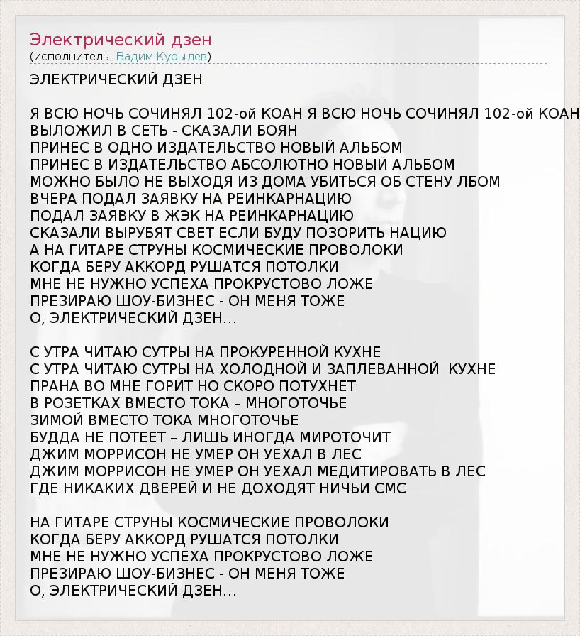 ЭЛЕКТРИЧЕСКИЙ ДЗЕН Я ВСЮ НОЧЬ СОЧИНЯЛ 102-ой КОАН Я ВСЮ НОЧЬ СОЧИНЯЛ 102-ой КОАН ВЫЛОЖИЛ В СЕТЬ - СКАЗАЛИ БОЯН ПРИНЕС В ОДНО ИЗДАТЕЛЬСТВО НОВЫЙ АЛЬБОМ ПРИНЕС В ИЗДАТЕЛЬСТВО АБСОЛЮТНО НОВЫЙ АЛЬБОМ МОЖНО БЫЛО НЕ ВЫХОДЯ ИЗ ДОМА УБИТЬСЯ ОБ СТЕНУ ЛБОМ ВЧЕРА ПОДАЛ ЗАЯВКУ НА РЕИНКАРНАЦИЮ ПОДАЛ ЗАЯВКУ В ЖЭК НА РЕИНКАРНАЦИЮ СКАЗАЛИ ВЫРУБЯТ СВЕТ ЕСЛИ БУДУ ПОЗОРИТЬ НАЦИЮ А НА ГИТАРЕ СТРУНЫ КОСМИЧЕСКИЕ ПРОВОЛОКИ КОГДА БЕРУ АККОРД РУШАТСЯ ПОТОЛКИ МНЕ НЕ НУЖНО УСПЕХА ПРОКРУСТОВО ЛОЖЕ ПРЕЗИРАЮ ШОУ-БИЗНЕС - ОН МЕНЯ ТОЖЕ О, ЭЛЕКТРИЧЕСКИЙ ДЗЕН… С УТРА ЧИТАЮ СУТРЫ НА ПРОКУРЕННОЙ КУХНЕ С УТРА ЧИТАЮ СУТРЫ НА ХОЛОДНОЙ И ЗАПЛЕВАННОЙ КУХНЕ ПРАНА ВО МНЕ ГОРИТ НО СКОРО ПОТУХНЕТ В РОЗЕТКАХ ВМЕСТО ТОКА – МНОГОТОЧЬЕ ЗИМОЙ ВМЕСТО ТОКА МНОГОТОЧЬЕ БУДДА НЕ ПОТЕЕТ – ЛИШЬ ИНОГДА МИРОТОЧИТ ДЖИМ МОРРИСОН НЕ УМЕР ОН УЕХАЛ В ЛЕС ДЖИМ МОРРИСОН НЕ УМЕР ОН УЕХАЛ МЕДИТИРОВАТЬ В ЛЕС ГДЕ НИКАКИХ ДВЕРЕЙ И НЕ ДОХОДЯТ НИЧЬИ СМС НА ГИТАРЕ СТРУНЫ КОСМИЧЕСКИЕ ПРОВОЛОКИ КОГДА БЕРУ АККОРД РУШАТСЯ ПОТОЛКИ МНЕ НЕ НУЖНО УСПЕХА ПРОКРУСТОВО ЛОЖЕ ПРЕЗИРАЮ ШОУ-БИЗНЕС - ОН МЕНЯ ТОЖЕ О, ЭЛЕКТРИЧЕСКИЙ ДЗЕН…