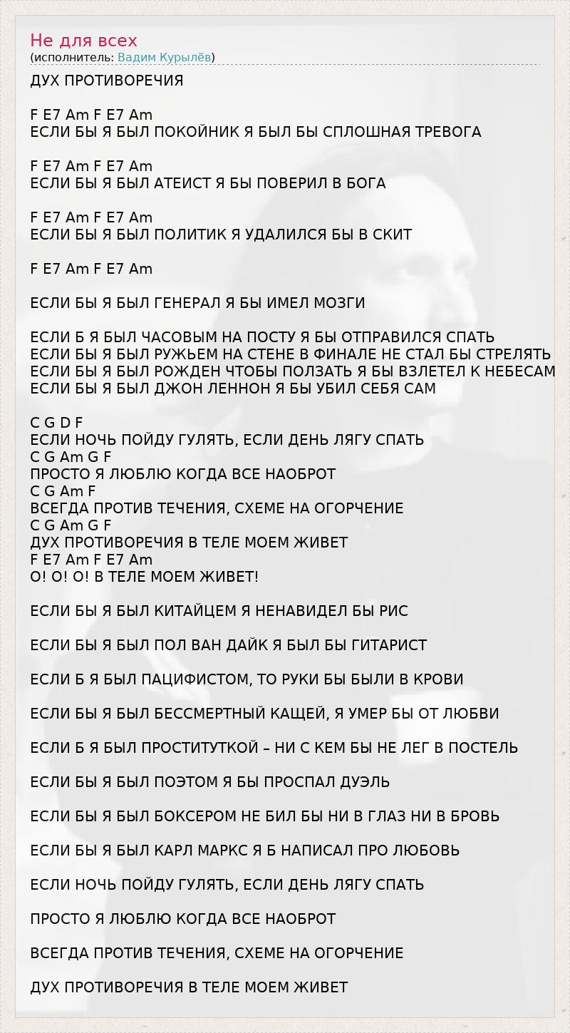 ДУХ ПРОТИВОРЕЧИЯ F E7 Am F E7 Am ЕСЛИ БЫ Я БЫЛ ПОКОЙНИК Я БЫЛ БЫ СПЛОШНАЯ ТРЕВОГА F E7 Am F E7 Am ЕСЛИ БЫ Я БЫЛ АТЕИСТ Я БЫ ПОВЕРИЛ В БОГА F E7 Am F E7 Am ЕСЛИ БЫ Я БЫЛ ПОЛИТИК Я УДАЛИЛСЯ БЫ В СКИТ F E7 Am F E7 Am ЕСЛИ БЫ Я БЫЛ ГЕНЕРАЛ Я БЫ ИМЕЛ МОЗГИ ЕСЛИ Б Я БЫЛ ЧАСОВЫМ НА ПОСТУ Я БЫ ОТПРАВИЛСЯ СПАТЬ ЕСЛИ БЫ Я БЫЛ РУЖЬЕМ НА СТЕНЕ В ФИНАЛЕ НЕ СТАЛ БЫ СТРЕЛЯТЬ ЕСЛИ БЫ Я БЫЛ РОЖДЕН ЧТОБЫ ПОЛЗАТЬ Я БЫ ВЗЛЕТЕЛ К НЕБЕСАМ ЕСЛИ БЫ Я БЫЛ ДЖОН ЛЕННОН Я БЫ УБИЛ СЕБЯ САМ C G D F ЕСЛИ НОЧЬ ПОЙДУ ГУЛЯТЬ, ЕСЛИ ДЕНЬ ЛЯГУ СПАТЬ C G Am G F ПРОСТО Я ЛЮБЛЮ КОГДА ВСЕ НАОБРОТ C G Am F ВСЕГДА ПРОТИВ ТЕЧЕНИЯ, СХЕМЕ НА ОГОРЧЕНИЕ C G Am G F ДУХ ПРОТИВОРЕЧИЯ В ТЕЛЕ МОЕМ ЖИВЕТ F E7 Am F E7 Am О! О! О! В ТЕЛЕ МОЕМ ЖИВЕТ! ЕСЛИ БЫ Я БЫЛ КИТАЙЦЕМ Я НЕНАВИДЕЛ БЫ РИС ЕСЛИ БЫ Я БЫЛ ПОЛ ВАН ДАЙК Я БЫЛ БЫ ГИТАРИСТ ЕСЛИ Б Я БЫЛ ПАЦИФИСТОМ, ТО РУКИ БЫ БЫЛИ В КРОВИ ЕСЛИ БЫ Я БЫЛ БЕССМЕРТНЫЙ КАЩЕЙ, Я УМЕР БЫ ОТ ЛЮБВИ ЕСЛИ Б Я БЫЛ ПРОСТИТУТКОЙ – НИ С КЕМ БЫ НЕ ЛЕГ В ПОСТЕЛЬ ЕСЛИ БЫ Я БЫЛ ПОЭТОМ Я БЫ ПРОСПАЛ ДУЭЛЬ ЕСЛИ БЫ Я БЫЛ БОКСЕРОМ НЕ БИЛ БЫ НИ В ГЛАЗ НИ В БРОВЬ ЕСЛИ БЫ Я БЫЛ КАРЛ МАРКС Я Б НАПИСАЛ ПРО ЛЮБОВЬ ЕСЛИ НОЧЬ ПОЙДУ ГУЛЯТЬ, ЕСЛИ ДЕНЬ ЛЯГУ СПАТЬ ПРОСТО Я ЛЮБЛЮ КОГДА ВСЕ НАОБРОТ ВСЕГДА ПРОТИВ ТЕЧЕНИЯ, СХЕМЕ НА ОГОРЧЕНИЕ ДУХ ПРОТИВОРЕЧИЯ В ТЕЛЕ МОЕМ ЖИВЕТ