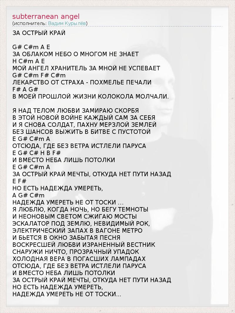 ЗА ОСТРЫЙ КРАЙ G# C#m A E ЗА ОБЛАКОМ НЕБО О МНОГОМ НЕ ЗНАЕТ H C#m A E МОЙ АНГЕЛ ХРАНИТЕЛЬ ЗА МНОЙ НЕ УСПЕВАЕТ G# C#m F# C#m ЛЕКАРСТВО ОТ СТРАХА - ПОХМЕЛЬЕ ПЕЧАЛИ F# A G# В МОЕЙ ПРОШЛОЙ ЖИЗНИ КОЛОКОЛА МОЛЧАЛИ. Я НАД ТЕЛОМ ЛЮБВИ ЗАМИРАЮ СКОРБЯ В ЭТОЙ НОВОЙ ВОЙНЕ КАЖДЫЙ САМ ЗА СЕБЯ И Я СНОВА СОЛДАТ, ПАХНУ МЕРЗЛОЙ ЗЕМЛЕЙ БЕЗ ШАНСОВ ВЫЖИТЬ В БИТВЕ С ПУСТОТОЙ E G# C#m A ОТСЮДА, ГДЕ БЕЗ ВЕТРА ИСТЛЕЛИ ПАРУСА E G# C# H B F# И ВМЕСТО НЕБА ЛИШЬ ПОТОЛКИ E G# C#m A ЗА ОСТРЫЙ КРАЙ МЕЧТЫ, ОТКУДА НЕТ ПУТИ НАЗАД E F# НО ЕСТЬ НАДЕЖДА УМЕРЕТЬ, A G# C#m НАДЕЖДА УМЕРЕТЬ НЕ ОТ ТОСКИ … Я ЛЮБЛЮ, КОГДА НОЧЬ, НО БЕГУ ТЕМНОТЫ И НЕОНОВЫМ СВЕТОМ СЖИГАЮ МОСТЫ ЭСКАЛАТОР ПОД ЗЕМЛЮ, НЕВИДИМЫЙ РОК, ЭЛЕКТРИЧЕСКИЙ ЗАПАХ В ВАГОНЕ МЕТРО И БЬЕТСЯ В ОКНО ЗАБЫТАЯ ПЕСНЯ ВОСКРЕСШЕЙ ЛЮБВИ ИЗРАНЕННЫЙ ВЕСТНИК СНАРУЖИ НИЧТО, ПРОЗРАЧНЫЙ УПАДОК ХОЛОДНАЯ ВЕРА В ПОГАСШИХ ЛАМПАДАХ ОТСЮДА, ГДЕ БЕЗ ВЕТРА ИСТЛЕЛИ ПАРУСА И ВМЕСТО НЕБА ЛИШЬ ПОТОЛКИ ЗА ОСТРЫЙ КРАЙ МЕЧТЫ, ОТКУДА НЕТ ПУТИ НАЗАД НО ЕСТЬ НАДЕЖДА УМЕРЕТЬ, НАДЕЖДА УМЕРЕТЬ НЕ ОТ ТОСКИ...