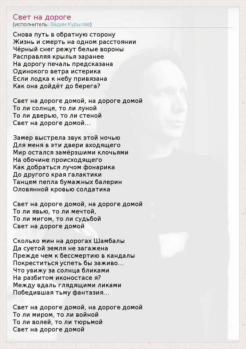 Снова путь в обратную сторону Жизнь и смерть на одном расстоянии Чёрный снег режут белые вороны Расправляя крылья заранее На дорогу печаль предсказана Одинокого ветра истерика Если лодка к небу привязана Как она дойдёт до берега? Свет на дороге домой, на дороге домой То ли солнце, то ли луной То ли дверью, то ли стеной Свет на дороге домой… Замер выстрела звук этой ночью Для меня в эти двери входящего Мир остался замёрзшими клочьями На обочине происходящего Как добраться лучом фонарика До другого края галактики Танцем пепла бумажных балерин Оловянной кровью солдатика Свет на дороге домой, на дороге домой То ли явью, то ли мечтой, То ли мигом, то ли судьбой Свет на дороге домой Сколько мин на дорогах Шамбалы Да суетой земля не загажена Прежде чем к бессмертию в кандалы Покреститься успеть бы заживо… Что увижу за солнца бликами На разбитом иконостасе я? Между вдаль глядящими ликами Победившая тьму фантазия… Свет на дороге домой, на дороге домой То ли миром, то ли войной То ли волей, то ли тюрьмой Свет на дороге домой