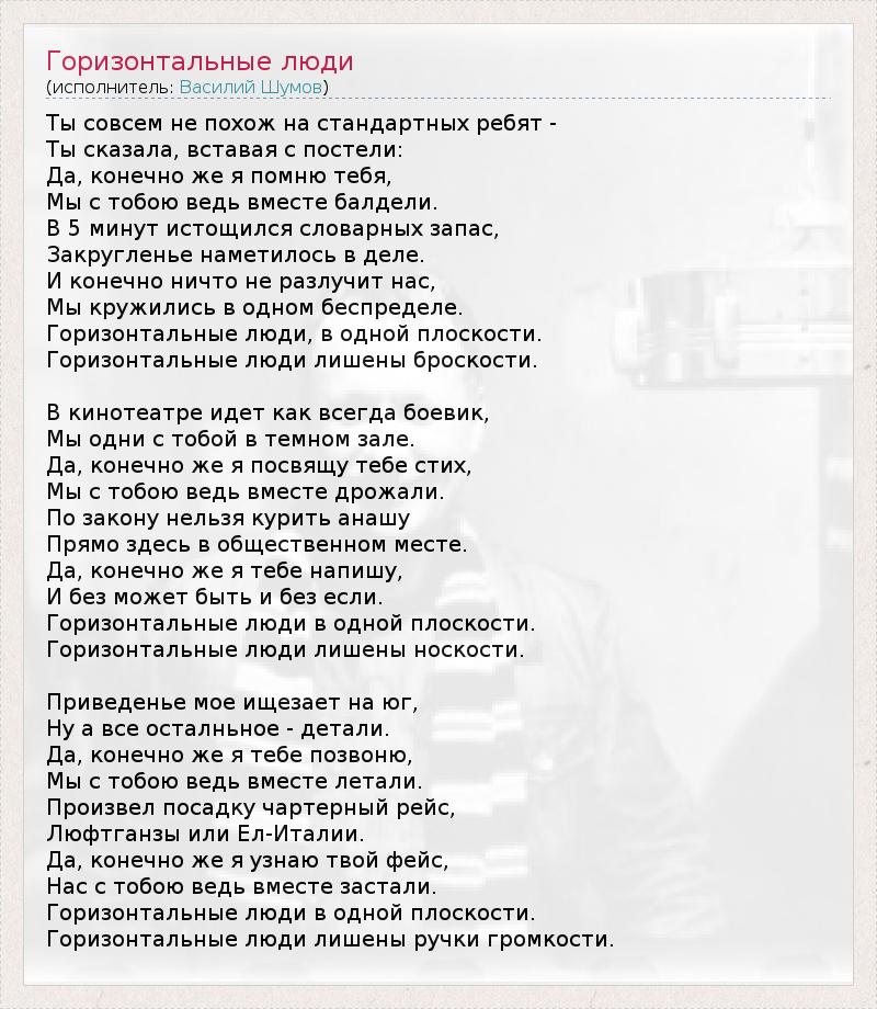 Ты совсем не похож на стандартных ребят - Ты сказала, вставая с постели: Да, конечно же я помню тебя, Мы с тобою ведь вместе балдели. В 5 минут истощился словарных запас, Закругленье наметилось в деле. И конечно ничто не разлучит нас, Мы кружились в одном беспределе. Горизонтальные люди, в одной плоскости. Горизонтальные люди лишены броскости. В кинотеатре идет как всегда боевик, Мы одни с тобой в темном зале. Да, конечно же я посвящу тебе стих, Мы с тобою ведь вместе дрожали. По закону нельзя курить анашу Прямо здесь в общественном месте. Да, конечно же я тебе напишу, И без может быть и без если. Горизонтальные люди в одной плоскости. Горизонтальные люди лишены носкости. Приведенье мое ищезает на юг, Ну а все осталньное - детали. Да, конечно же я тебе позвоню, Мы с тобою ведь вместе летали. Произвел посадку чартерный рейс, Люфтганзы или Ел-Италии. Да, конечно же я узнаю твой фейс, Нас с тобою ведь вместе застали. Горизонтальные люди в одной плоскости. Горизонтальные люди лишены ручки громкости.