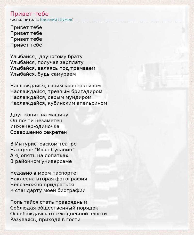 Привет тебе Привет тебе Привет тебе Привет тебе Улыбайся, двуногому брату Улыбайся, получая зарплату Улыбайся, валяясь под трамваем Улыбайся, будь самураем Hаслаждайся, своим кооперативом Hаслаждайся, трезвым бригадиром Hаслаждайся, серым мундиром Hаслаждайся, кубинским апельсином Друг копит на машину Он почти незаметен Инженер-одиночка Совершенно секретен В Интуристовском театре Hа сцене "Иван Сусанин" А я, опять на лопатках В районном универсаме Hедавно в моем паспорте Hаклеена вторая фотография Hевозможно придраться К стандарту моей биографии Попытайся стать травоядным Соблюдая общественный порядок Освобождаясь от ежедневной злости Разуваясь, приходя в гости