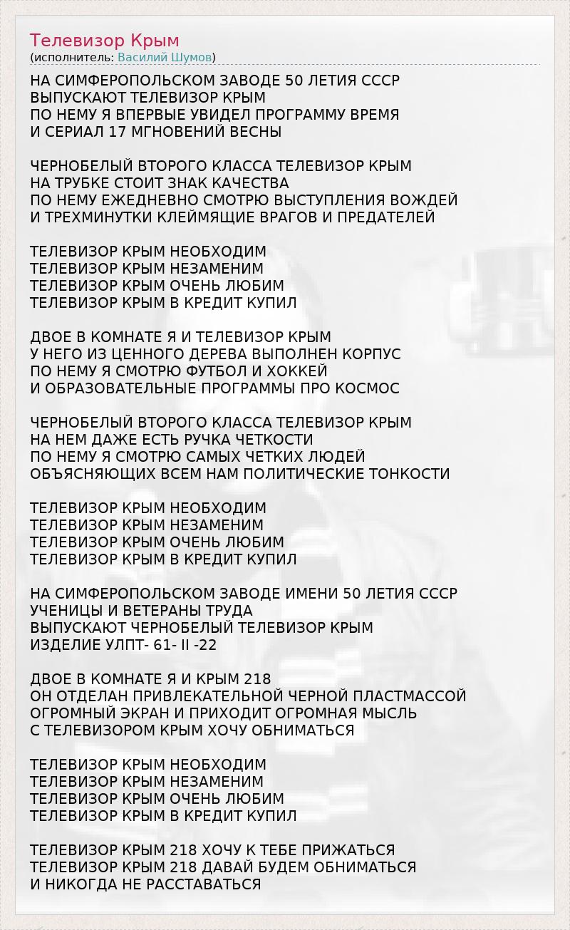 НА СИМФЕРОПОЛЬСКОМ ЗАВОДЕ 50 ЛЕТИЯ СССР ВЫПУСКАЮТ ТЕЛЕВИЗОР КРЫМ ПО НЕМУ Я ВПЕРВЫЕ УВИДЕЛ ПРОГРАММУ ВРЕМЯ И СЕРИАЛ 17 МГНОВЕНИЙ ВЕСНЫ ЧЕРНОБЕЛЫЙ ВТОРОГО КЛАССА ТЕЛЕВИЗОР КРЫМ НА ТРУБКЕ СТОИТ ЗНАК КАЧЕСТВА ПО НЕМУ ЕЖЕДНЕВНО СМОТРЮ ВЫСТУПЛЕНИЯ ВОЖДЕЙ И ТРЕХМИНУТКИ КЛЕЙМЯЩИЕ ВРАГОВ И ПРЕДАТЕЛЕЙ ТЕЛЕВИЗОР КРЫМ НЕОБХОДИМ ТЕЛЕВИЗОР КРЫМ НЕЗАМЕНИМ ТЕЛЕВИЗОР КРЫМ ОЧЕНЬ ЛЮБИМ ТЕЛЕВИЗОР КРЫМ В КРЕДИТ КУПИЛ ДВОЕ В КОМНАТЕ Я И ТЕЛЕВИЗОР КРЫМ У НЕГО ИЗ ЦЕННОГО ДЕРЕВА ВЫПОЛНЕН КОРПУС ПО НЕМУ Я СМОТРЮ ФУТБОЛ И ХОККЕЙ И ОБРАЗОВАТЕЛЬНЫЕ ПРОГРАММЫ ПРО КОСМОС ЧЕРНОБЕЛЫЙ ВТОРОГО КЛАССА ТЕЛЕВИЗОР КРЫМ НА НЕМ ДАЖЕ ЕСТЬ РУЧКА ЧЕТКОСТИ ПО НЕМУ Я СМОТРЮ САМЫХ ЧЕТКИХ ЛЮДЕЙ ОБЪЯСНЯЮЩИХ ВСЕМ НАМ ПОЛИТИЧЕСКИЕ ТОНКОСТИ ТЕЛЕВИЗОР КРЫМ НЕОБХОДИМ ТЕЛЕВИЗОР КРЫМ НЕЗАМЕНИМ ТЕЛЕВИЗОР КРЫМ ОЧЕНЬ ЛЮБИМ ТЕЛЕВИЗОР КРЫМ В КРЕДИТ КУПИЛ НА СИМФЕРОПОЛЬСКОМ ЗАВОДЕ ИМЕНИ 50 ЛЕТИЯ СССР УЧЕНИЦЫ И ВЕТЕРАНЫ ТРУДА ВЫПУСКАЮТ ЧЕРНОБЕЛЫЙ ТЕЛЕВИЗОР КРЫМ ИЗДЕЛИЕ УЛПТ- 61- II -22 ДВОЕ В КОМНАТЕ Я И КРЫМ 218 ОН ОТДЕЛАН ПРИВЛЕКАТЕЛЬНОЙ ЧЕРНОЙ ПЛАСТМАССОЙ ОГРОМНЫЙ ЭКРАН И ПРИХОДИТ ОГРОМНАЯ МЫСЛЬ С ТЕЛЕВИЗОРОМ КРЫМ ХОЧУ ОБНИМАТЬСЯ ТЕЛЕВИЗОР КРЫМ НЕОБХОДИМ ТЕЛЕВИЗОР КРЫМ НЕЗАМЕНИМ ТЕЛЕВИЗОР КРЫМ ОЧЕНЬ ЛЮБИМ ТЕЛЕВИЗОР КРЫМ В КРЕДИТ КУПИЛ ТЕЛЕВИЗОР КРЫМ 218 ХОЧУ К ТЕБЕ ПРИЖАТЬСЯ ТЕЛЕВИЗОР КРЫМ 218 ДАВАЙ БУДЕМ ОБНИМАТЬСЯ И НИКОГДА НЕ РАССТАВАТЬСЯ