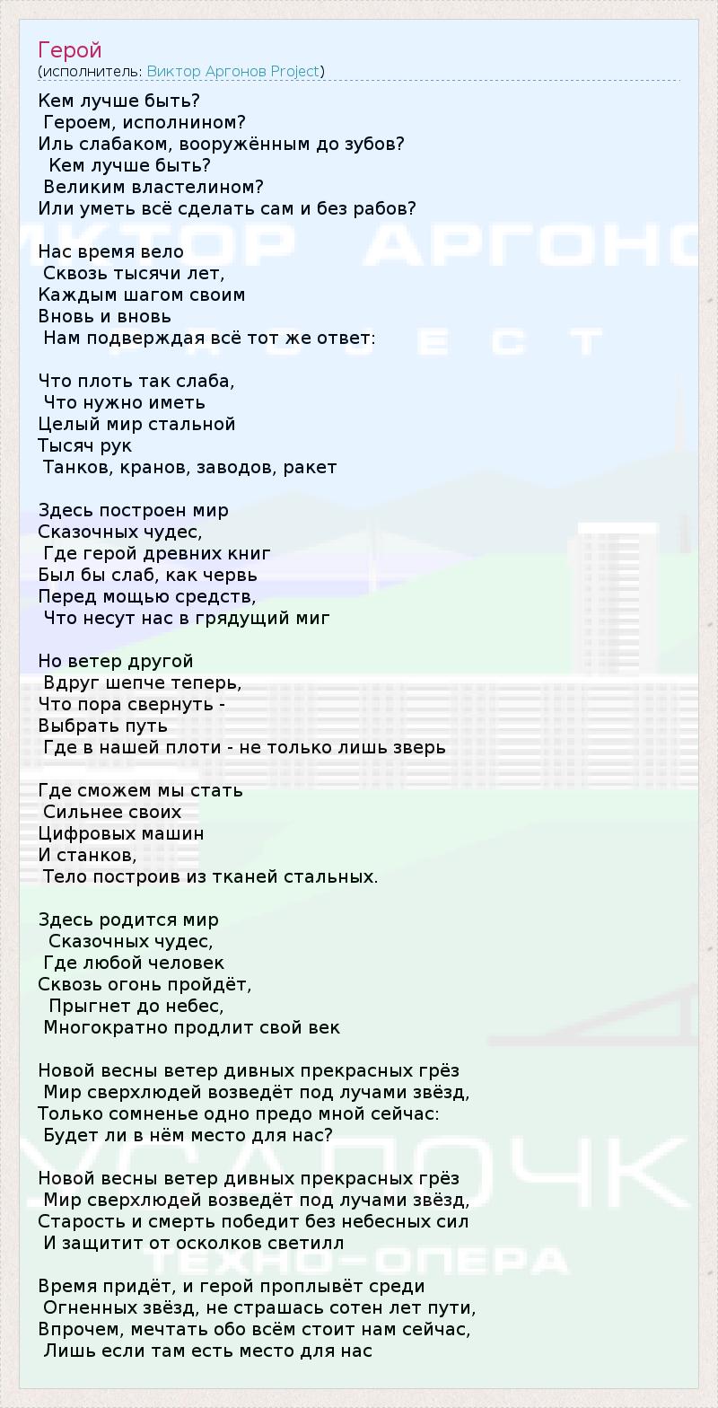 Кем лучше быть? Героем, исполнином? Иль слабаком, вооружённым до зубов? Кем лучше быть? Великим властелином? Или уметь всё сделать сам и без рабов? Нас время вело Сквозь тысячи лет, Каждым шагом своим Вновь и вновь Нам подверждая всё тот же ответ: Что плоть так слаба, Что нужно иметь Целый мир стальной Тысяч рук Танков, кранов, заводов, ракет Здесь построен мир Сказочных чудес, Где герой древних книг Был бы слаб, как червь Перед мощью средств, Что несут нас в грядущий миг Но ветер другой Вдруг шепче теперь, Что пора свернуть - Выбрать путь Где в нашей плоти - не только лишь зверь Где сможем мы стать Сильнее своих Цифровых машин И станков, Тело построив из тканей стальных. Здесь родится мир Сказочных чудес, Где любой человек Сквозь огонь пройдёт, Прыгнет до небес, Многократно продлит свой век Новой весны ветер дивных прекрасных грёз Мир сверхлюдей возведёт под лучами звёзд, Только сомненье одно предо мной сейчас: Будет ли в нём место для нас? Новой весны ветер дивных прекрасных грёз Мир сверхлюдей возведёт под лучами звёзд, Старость и смерть победит без небесных сил И защитит от осколков светилл Время придёт, и герой проплывёт среди Огненных звёзд, не страшась сотен лет пути, Впрочем, мечтать обо всём стоит нам сейчас, Лишь если там есть место для нас