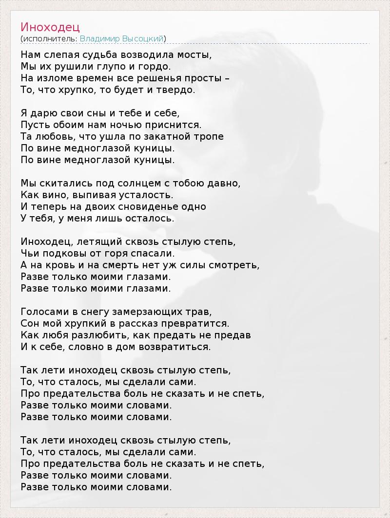 Нам слепая судьба возводила мосты, Мы их рушили глупо и гордо. На изломе времен все решенья просты – То, что хрупко, то будет и твердо. Я дарю свои сны и тебе и себе, Пусть обоим нам ночью приснится. Та любовь, что ушла по закатной тропе По вине медноглазой куницы. По вине медноглазой куницы. Мы скитались под солнцем с тобою давно, Как вино, выпивая усталость. И теперь на двоих сновиденье одно У тебя, у меня лишь осталось. Иноходец, летящий сквозь стылую степь, Чьи подковы от горя спасали. А на кровь и на смерть нет уж силы смотреть, Разве только моими глазами. Разве только моими глазами. Голосами в снегу замерзающих трав, Сон мой хрупкий в рассказ превратится. Как любя разлюбить, как предать не предав И к себе, словно в дом возвратиться. Так лети иноходец сквозь стылую степь, То, что сталось, мы сделали сами. Про предательства боль не сказать и не спеть, Разве только моими словами. Разве только моими словами. Так лети иноходец сквозь стылую степь, То, что сталось, мы сделали сами. Про предательства боль не сказать и не спеть, Разве только моими словами. Разве только моими словами.