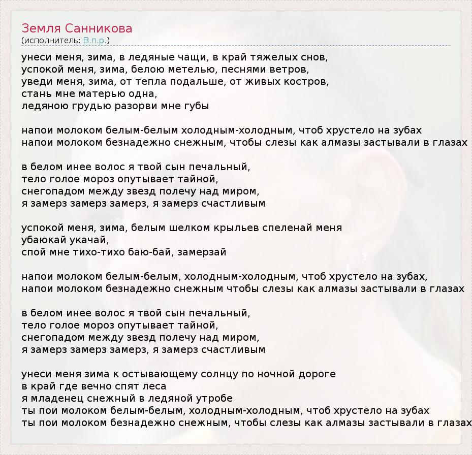 унеси меня, зима, в ледяные чащи, в край тяжелых снов, успокой меня, зима, белою метелью, песнями ветров, уведи меня, зима, от тепла подальше, от живых костров, стань мне матерью одна, ледяною грудью разорви мне губы напои молоком белым-белым холодным-холодным, чтоб хрустело на зубах напои молоком безнадежно снежным, чтобы слезы как алмазы застывали в глазах в белом инее волос я твой сын печальный, тело голое мороз опутывает тайной, снегопадом между звезд полечу над миром, я замерз замерз замерз, я замерз счастливым успокой меня, зима, белым шелком крыльев спеленай меня убаюкай укачай, спой мне тихо-тихо баю-бай, замерзай напои молоком белым-белым, холодным-холодным, чтоб хрустело на зубах, напои молоком безнадежно снежным чтобы слезы как алмазы застывали в глазах в белом инее волос я твой сын печальный, тело голое мороз опутывает тайной, снегопадом между звезд полечу над миром, я замерз замерз замерз, я замерз счастливым унеси меня зима к остывающему солнцу по ночной дороге в край где вечно спят леса я младенец снежный в ледяной утробе ты пои молоком белым-белым, холодным-холодным, чтоб хрустело на зубах ты пои молоком безнадежно снежным, чтобы слезы как алмазы застывали в глазах
