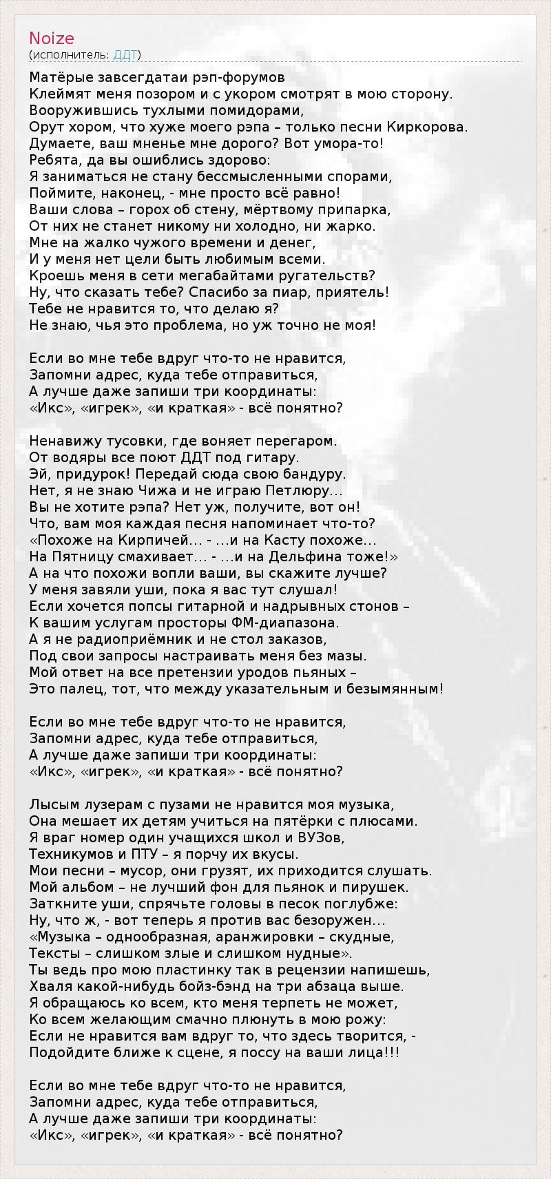 Это интересно:«ДДТ» («DDT») — российская рок-группа, основанная в 1980 году в Уфе. Лидер группы, автор большинства песен и единственный бессменный участник — поэт, композитор, исполнитель, художник, актёр и продюсер Юрий Шевчук.Название группы происходит от химического вещества ДДТ = Ди-хлор-Ди-фенил-Три-хлор-метил-метан, которое использовалось при борьбе с насекомыми-паразитами, запрещенное в большинстве... продолжение