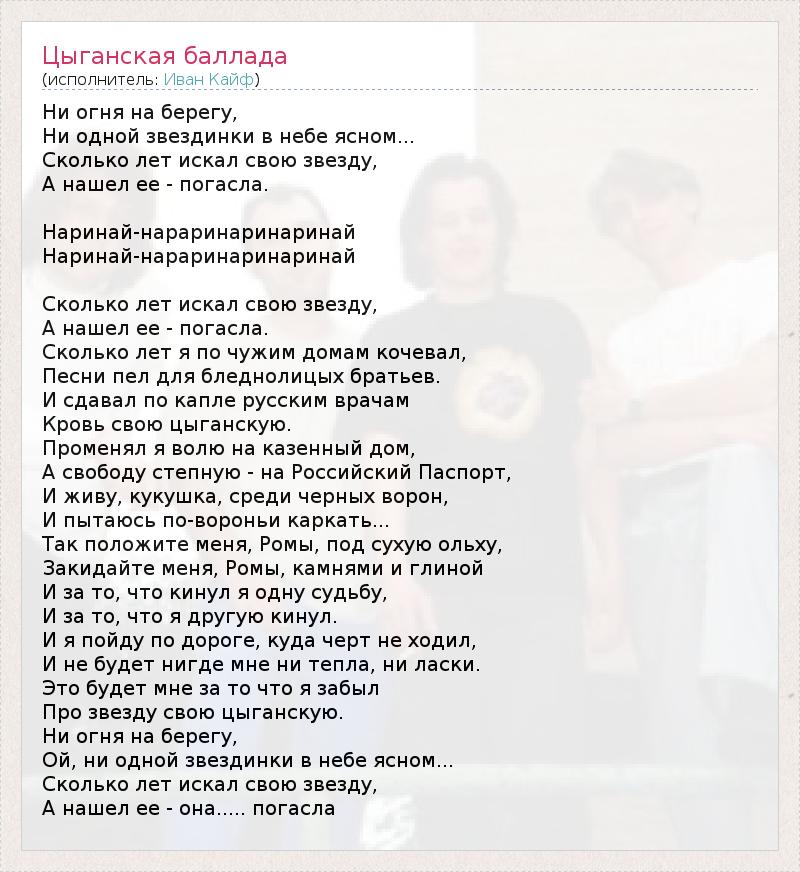 Ни огня на берегу, Ни одной звездинки в небе ясном... Сколько лет искал свою звезду, А нашел ее - погасла. Наринай-нараринаринаринай Наринай-нараринаринаринай Сколько лет искал свою звезду, А нашел ее - погасла. Сколько лет я по чужим домам кочевал, Песни пел для бледнолицых братьев. И сдавал по капле русским врачам Кровь свою цыганскую. Променял я волю на казенный дом, А свободу степную - на Российский Паспорт, И живу, кукушка, среди черных ворон, И пытаюсь по-вороньи каркать... Так положите меня, Ромы, под сухую ольху, Закидайте меня, Ромы, камнями и глиной И за то, что кинул я одну судьбу, И за то, что я другую кинул. И я пойду по дороге, куда черт не ходил, И не будет нигде мне ни тепла, ни ласки. Это будет мне за то что я забыл Про звезду свою цыганскую. Ни огня на берегу, Ой, ни одной звездинки в небе ясном... Сколько лет искал свою звезду, А нашел ее - она..... погасла