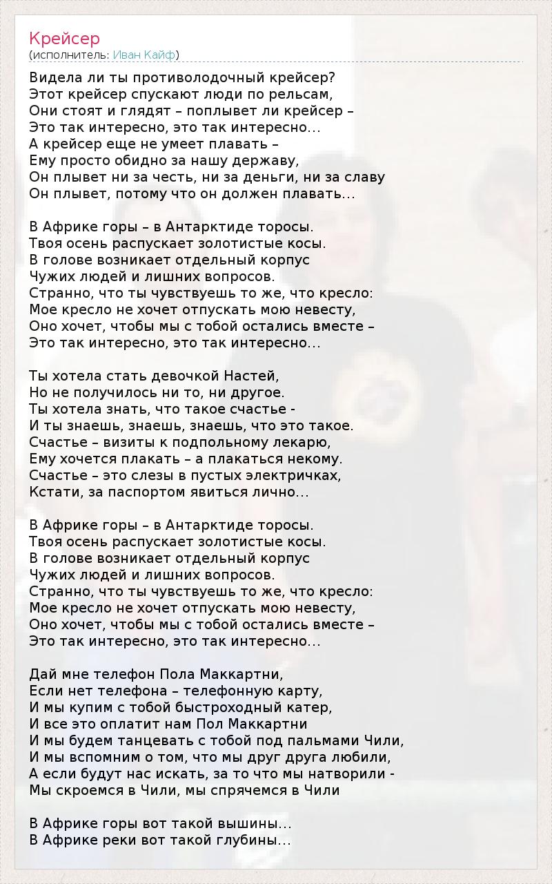Видела ли ты противолодочный крейсер? Этот крейсер спускают люди по рельсам, Они стоят и глядят – поплывет ли крейсер – Это так интересно, это так интересно… А крейсер еще не умеет плавать – Ему просто обидно за нашу державу, Он плывет ни за честь, ни за деньги, ни за славу Он плывет, потому что он должен плавать… В Африке горы – в Антарктиде торосы. Твоя осень распускает золотистые косы. В голове возникает отдельный корпус Чужих людей и лишних вопросов. Странно, что ты чувствуешь то же, что кресло: Мое кресло не хочет отпускать мою невесту, Оно хочет, чтобы мы с тобой остались вместе – Это так интересно, это так интересно… Ты хотела стать девочкой Настей, Но не получилось ни то, ни другое. Ты хотела знать, что такое счастье - И ты знаешь, знаешь, знаешь, что это такое. Счастье – визиты к подпольному лекарю, Ему хочется плакать – а плакаться некому. Счастье – это слезы в пустых электричках, Кстати, за паспортом явиться лично… В Африке горы – в Антарктиде торосы. Твоя осень распускает золотистые косы. В голове возникает отдельный корпус Чужих людей и лишних вопросов. Странно, что ты чувствуешь то же, что кресло: Мое кресло не хочет отпускать мою невесту, Оно хочет, чтобы мы с тобой остались вместе – Это так интересно, это так интересно… Дай мне телефон Пола Маккартни, Если нет телефона – телефонную карту, И мы купим с тобой быстроходный катер, И все это оплатит нам Пол Маккартни И мы будем танцевать с тобой под пальмами Чили, И мы вспомним о том, что мы друг друга любили, А если будут нас искать, за то что мы натворили - Мы скроемся в Чили, мы спрячемся в Чили В Африке горы вот такой вышины… В Африке реки вот такой глубины…