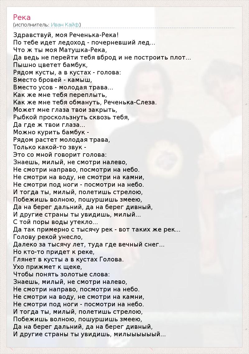 Здравствуй, моя Реченька-Река! По тебе идет ледоход - почерневший лед... Что ж ты моя Матушка-Река, Да ведь не перейти тебя вброд и не построить плот... Пышно цветет бамбук, Рядом кусты, а в кустах - голова: Вместо бровей - камыш, Вместо усов - молодая трава... Как же мне тебя переплыть, Как же мне тебя обмануть, Реченька-Слеза. Может мне глаза твои закрыть, Рыбкой проскользнуть сквозь тебя, Да где ж твои глаза... Можно курить бамбук - Рядом растет молодая трава, Только какой-то звук - Это со мной говорит голова: Знаешь, милый, не смотри налево, Не смотри направо, посмотри на небо. Не смотри на воду, не смотри на камни, Не смотри под ноги - посмотри на небо. И тогда ты, милый, полетишь стрелою, Побежишь волною, пошуршишь змеею, Да на берег дальний, да на берег дивный, И другие страны ты увидишь, милый... С той поры воды утекло... Да так примерно с тысячу рек - вот таких же рек... Голову рекой унесло, Далеко за тысячу лет, туда где вечный снег... Но кто-то придет к реке, Глянет в кусты а в кустах Голова. Ухо прижмет к щеке, Чтобы понять золотые слова: Знаешь, милый, не смотри налево, Не смотри направо, посмотри на небо. Не смотри на воду, не смотри на камни, Не смотри под ноги - посмотри на небо. И тогда ты, милый, полетишь стрелою, Побежишь волною, пошуршишь змеею, Да на берег дальний, да на берег дивный, И другие страны ты увидишь, милыыыыыый...