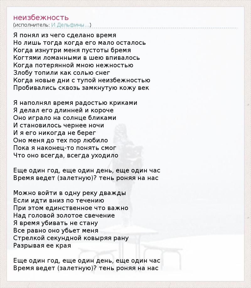 Я понял из чего сделано время Но лишь тогда когда его мало осталось Когда изнутри меня пустоты бремя Когтями ломанными в шею впивалось Когда потерянной мною нежностью Злобу топили как солью снег Когда новые дни с тупой неизбежностью Пробивались сквозь замкнутую кожу век Я наполнял время радостью криками Я делал его длинней и короче Оно играло на солнце бликами И становилось чернее ночи И я его никогда не берег Оно меня до тех пор любило Пока я наконец-то понять смог Что оно всегда, всегда уходило Еще один год, еще один день, еще один час Время ведет (залетную)? тень роняя на нас Можно войти в одну реку дважды Если идти вниз по течению При этом единственное что важно Над головой золотое свечение Я время убивать не стану Все равно оно убьет меня Стрелкой секундной ковыряя рану Разрывая ее края Еще один год, еще один день, еще один час Время ведет (залетную)? тень роняя на нас