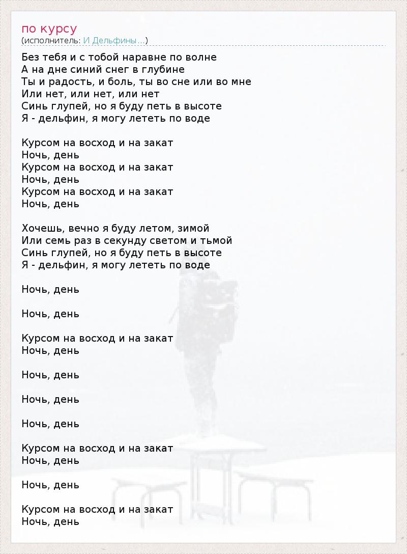 Без тебя и с тобой наравне по волне А на дне синий снег в глубине Ты и радость, и боль, ты во сне или во мне Или нет, или нет, или нет Синь глупей, но я буду петь в высоте Я - дельфин, я могу лететь по воде Курсом на восход и на закат Ночь, день Курсом на восход и на закат Ночь, день Курсом на восход и на закат Ночь, день Хочешь, вечно я буду летом, зимой Или семь раз в секунду светом и тьмой Синь глупей, но я буду петь в высоте Я - дельфин, я могу лететь по воде Ночь, день Ночь, день Курсом на восход и на закат Ночь, день Ночь, день Ночь, день Ночь, день Курсом на восход и на закат Ночь, день Ночь, день Курсом на восход и на закат Ночь, день