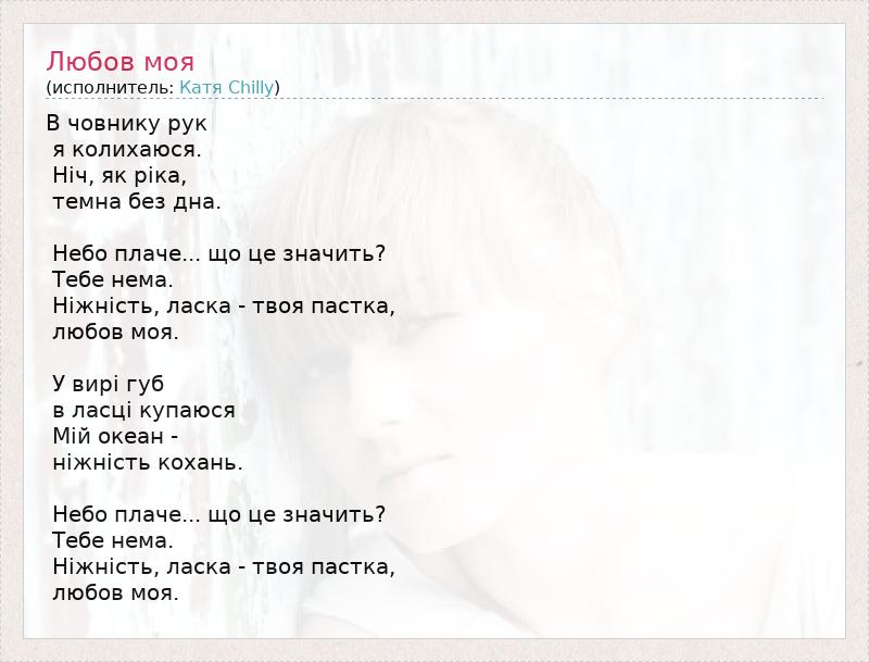 В човнику рук я колихаюся. Ніч, як ріка, темна без дна. Небо плаче... що це значить? Тебе нема. Ніжність, ласка - твоя пастка, любов моя. У вирі губ в ласці купаюся Мій океан - ніжність кохань. Небо плаче... що це значить? Тебе нема. Ніжність, ласка - твоя пастка, любов моя.