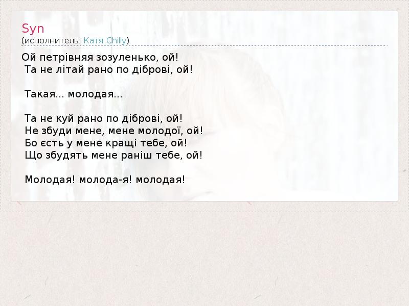 Ой петрівняя зозуленько, ой! Та не літай рано по діброві, ой! Такая... молодая... Та не куй рано по діброві, ой! Не збуди мене, мене молодої, ой! Бо єсть у мене кращі тебе, ой! Що збудять мене раніш тебе, ой! Молодая! молода-я! молодая!