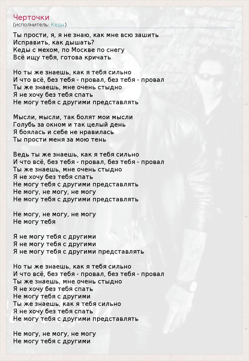 Ты прости, я, я не знаю, как мне всю зашить Исправить, как дышать? Кеды с мехом, по Москве по снегу Всё ищу тебя, готова кричать Но ты же знаешь, как я тебя сильно И что всё, без тебя - провал, без тебя - провал Ты же знаешь, мне очень стыдно Я не хочу без тебя спать Не могу тебя с другими представлять Мысли, мысли, так болят мои мысли Голубь за окном и так целый день Я боялась и себе не нравилась Ты прости меня за мою тень Ведь ты же знаешь, как я тебя сильно И что всё, без тебя - провал, без тебя - провал Ты же знаешь, мне очень стыдно Я не хочу без тебя спать Не могу тебя с другими представлять Не могу, не могу, не могу Не могу тебя с другими представлять Не могу, не могу, не могу Не могу тебя Я не могу тебя с другими Я не могу тебя с другими Я не могу тебя с другими представлять Но ты же знаешь, как я тебя сильно И что всё, без тебя - провал, без тебя - провал Ты же знаешь, мне очень стыдно Я не хочу без тебя спать Не могу тебя с другими Ты же знаешь, как я тебя сильно Я не хочу без тебя спать Не могу тебя с другими представлять Не могу, не могу, не могу Не могу тебя с другими